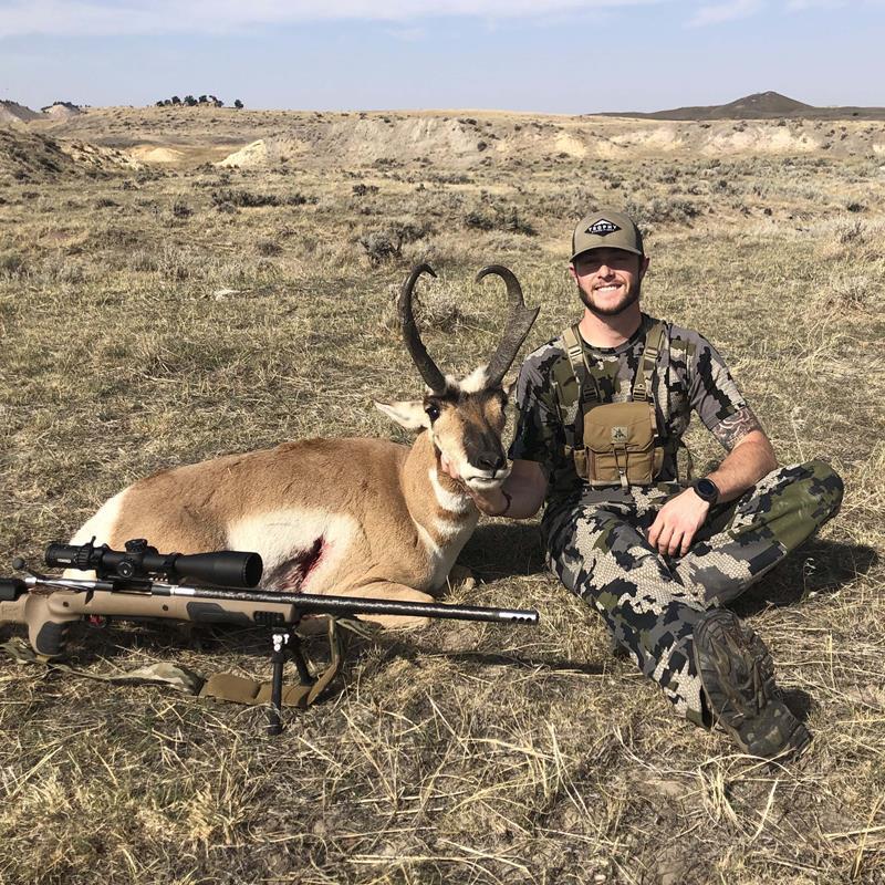 and hunt through October 12th. From where we live in South Mississippi, our drive would be a little over 24 hours to where we were hunting. Knowing that our drive would take over a day, we didn’t have any time to waste once we arrived.After driving all day and all night, we finally made it to camp around 11:30 a.m. on October 9th. After unloading the truck, we gathered all of our gear and headed out for the rest of the day. At our first glassing point, we spotted a group of about 20 antelope that were bedded down on a nearby ridge. After close consideration, we decided to pass on this group in hopes of finding a better buck. As we were hiking to another spot, I noticed a small group of four feeding in the sage. After a closer look, one of the bucks really stood out to me and I couldn’t pass up this opportunity. At this point, the bucks were at around 800 yards. I needed to get to at least 400 yards for a comfortable shot. Keeping cottonwood trees between us and the bucks helped us close the distance even more, and I was able to set up for a shot at 342 yards. After getting the range on him, I squeezed off the shot and drilled him! By 2:45 p.m. on the first afternoon, I was on the board with a great buck.