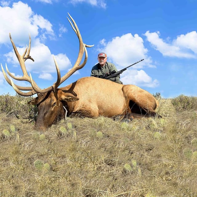 We made our move. Staying below the skyline, we crossed several ravines, carefully keeping our wind in check. As we crested the ridge, we saw the elk disappear into the drainage, but we couldn’t approach directly because of the cows still being visible. We backtracked 300 yards and circled below them. Cautiously, we approached the ravine where we had last seen them. Rusty cow called, and we got a response. The bull bugled, revealing his position. We were close. After several more cow calls, six cows appeared across the ravine, and then the smaller 6x6 walked up behind them. Suddenly, the whaletail bull emerged in front of them broadside at 220 yards. Rusty whispered, “Get on the sticks and shoot.” I was already set. As the crosshairs settled on