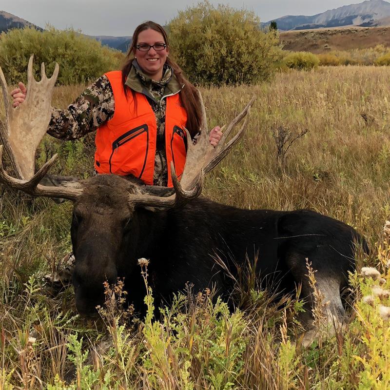 We needed to kill this moose. The sun was starting to set, so we didn’t have much time. We got around and started to walk to where we thought they were. I thought they were closer, but my husband said no. At that point, the bull jumped out of the willows and started to run away. All I saw were wide, massive antlers. I got down with my gun on my shooting sticks, and my husband cow called and said to hold dead on. I pulled the trigger at 320 yards. The bull went down, but they are massive animals. I got within 200 yards, and he stood up. I put another round in him. He dropped and kicked his leg up. I had just shot the moose-of-a-lifetime for me. The sun was setting, and we had a long night of packing moose out. Our great friends drove over to help. We finally got the moose out at around midnight and back to camp we went.