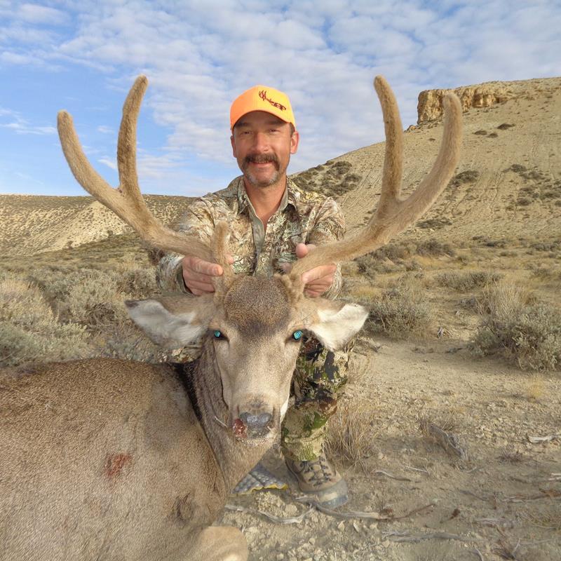The opening of deer brought 30-40 mph winds where I was looking for a velvet forked horn buck that I had seen two days prior. Opening day was a wash. I had seen very few deer on this hunt, so the next morning, we were back after velvet. Katelyn dropped Jake and me off and drove to a predetermined pickup spot. With no wind, we hiked out to a vantage point. As we sat our backpacks down, Jake said, “There goes four deer. The one in the back has horns.” I dropped down behind my rifle. They surprisingly stopped at 237 yards and velvet was down.