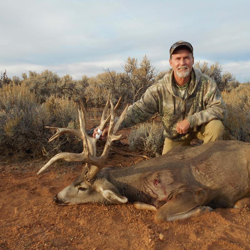 The brush was so tall that I could find his horns but not much more. When he hit a small opening, I shot and watched him go down in my scope. Learning from past experience, I told Mike to watch him and got up higher to see better. Just as I was getting settled behind the scope, Mike hollered and said, “He’s up and leaving!” I quickly found him again and sent another one through a small opening and watched him drop again. I had Mike come up where I was sitting while I watched and then took time to reload before slowly walking out to a spot I had picked out as a landmark. What I found made my legs start to shake to the point I had to sit down. I’d hunted Colorado, Wyoming, Nevada, Idaho,and my home state of Utah several times. I had the honor of watching my wife kill a 215" buck some years back. I’d been privileged to help my kids kill several nice deer as well as many for myself, but to kill a deer like the one laying at the side of me fulfilled a lifelong dream.