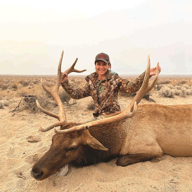 We spent many miles hunting and studying the herd throughout the season, which started on Saturday, October 2nd, until harvest day on October 7th. On the day of harvest, the herd went the complete opposite direction we had hoped, so we really had to get after them fast before they were long gone again for the day to hunker down. My husband, who is the most humble and patient guide, led me from start to finish. I was able to gain sight and keep in focus while I tracked this bull for at least a few minutes, but it felt like a lifetime with my vision blurring in and out and shaking pretty good. I finally got a clear view with no other cows or calves in the scope. I took a clear and clean shot at 400 yards, and he was down. I was so excited about that! I had been practicing for a few weeks prior with my father-in-law, who also guides me on my shooting skill and spoils me with his handloaded bullets/cartridges.