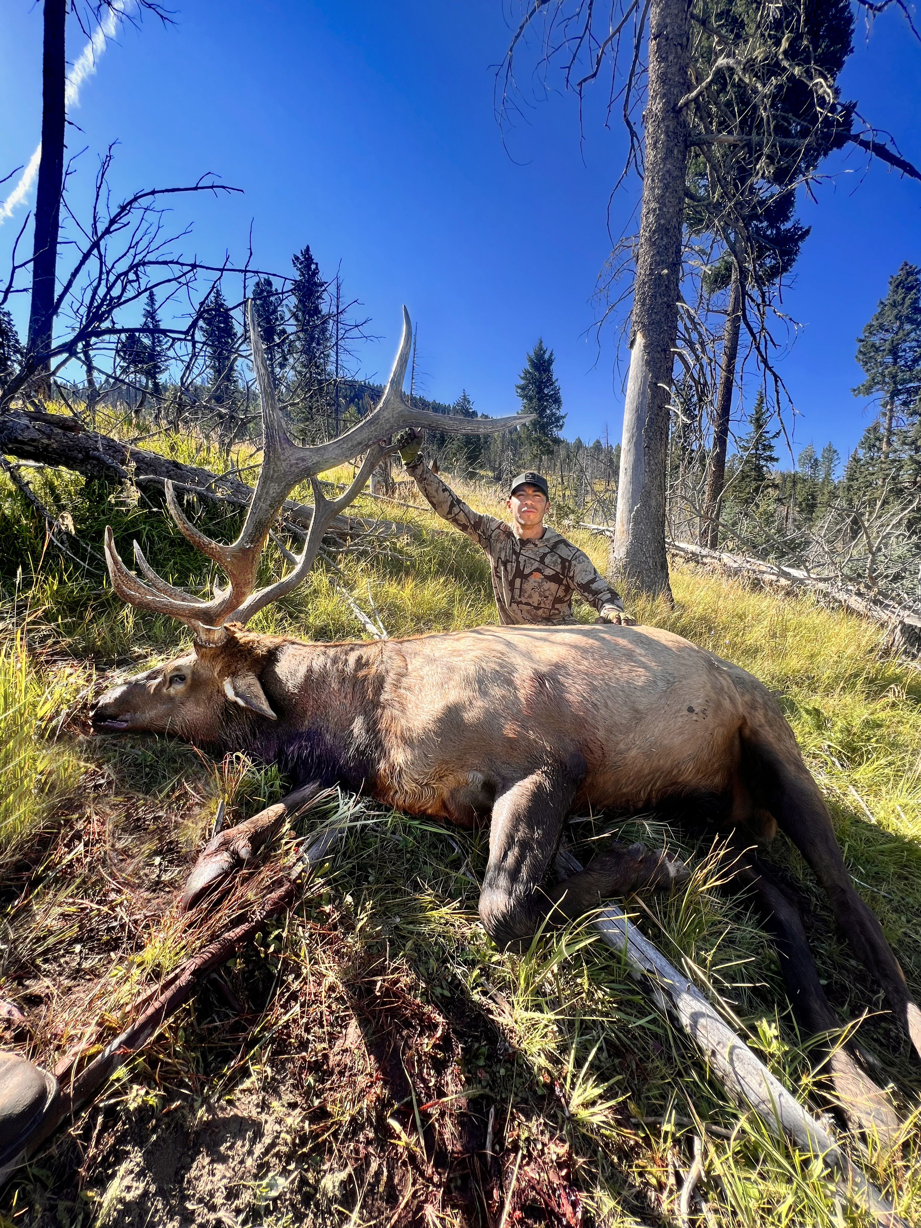 I had found an area that held a lot of cows and knew there would be bulls around. Due to the rules of the park, we had to camp about 15 minutes out, but then it’s an hour drive into the park where we hunt. Every morning, we woke up at 3:30 a.m. to head out. As we were climbing to the top, we hoped we were getting close to one of the big bulls. The days were very warm, and there were outfitters in the general area putting pressure on the elk. In the mornings, I could hear the other hunters making calls, and we would just slip around them.