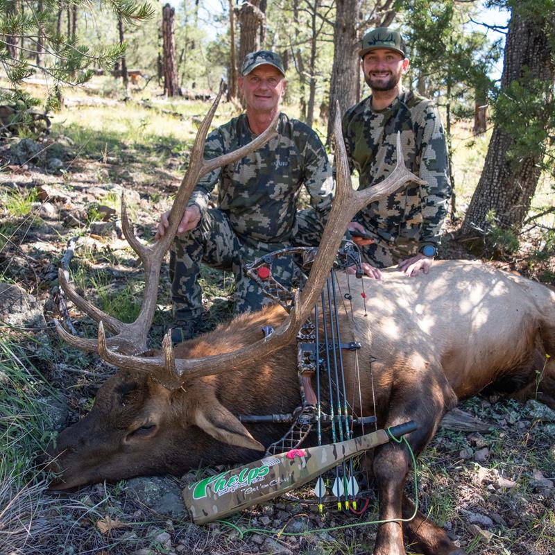 With three days left in the season and the weekend coming and expecting more pressure, I had decided to take the first decent bull I had a shot at. We started out back on the unit boundary at daylight and saw and heard elk in the morning. Then things slowed down, so we decided to move and set up on a water tank. We had a bull coming, but he didn't commit. With morning running out, we decided to hike up on the next ridge. We called into the next canyon and got a response on the next ridge over. We took off towards the bugling bull and kept calling to close in on him. By the time we got to the bottom of the canyon, he was coming up the ridge ahead of us and was coming fast. I moved ahead another 50 yards and set up next to a pine tree just as he came into view. Another soft cow call pulled him off the ridge and into the draw we were in. I picked an opening I thought he'd walk into and came to draw. I stopped him in the opening with a sfot cow call only for him to stop right behind the only little sapling in the opening. I couldn't stay at draw any longer and let down. I called in another direction behind the tree I was next to, causing him to change direction and give me another shot opportunity. Stopping him again at 40 yards, my release went off and the arrow hit a little high. I called and stopped him right away. He began coughing, so we knew he was hit in the lung and then he walked back up on the ridge he came off of and bedded down. We gave him an hour, which seemed to take forever. We hiked up to where we had last heard him, and my son said, "Hey, Dad, over here!" I knew what that meant without looking. This was a special moment because my son had been hunting with me since he was 12 (now 28) and had been in on many kills afterwards but had never actually been with me during the kill. This was a special celebration for us.