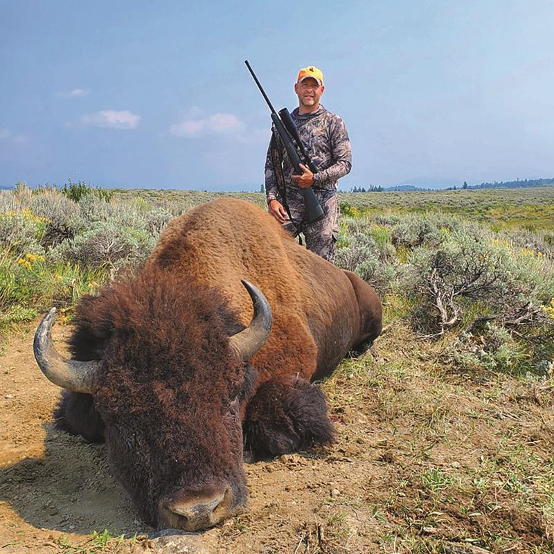 outside of Jackson, Wyoming. Rowdy took Dean and me for a seven-mile “warmup” while Dax glassed from below. Sure enough, Dax found a bull that he thought might be off the Grand Teton National Park. We went back the next morning to see if we could find him again, and there were hundreds of bison. We drove around to where we had been the day before and began the three and a half-mile walk to where we thought the bison was. As we crested that last little hill before hitting the park boundary, Dax gave the universal “get down” signal and everyone hit the dirt. He started pointing to the park line. Sure enough, somewhere very close to the line was a big, hooked bison horn sticking up out of the sagebrush. I really wanted to take my bison with a bow, but I also didn’t want to eat the tag. I was packing both my bow and a .300 Win. As we assessed the situation, it became clear that the bull was very close to the park line. I ranged the bison at 247 yards, and the park line was showing 261 yards away on my GPS. Perfect! With the bison that close to the line, I knew it was a bad idea to make an attempt with my bow. I handed Dean the bow and took my rifle from him. When the bull stood up, he looked like a big black Volkswagen! It took three well-placed rounds in the boiler room and one in the point of each shoulder to ultimately bring the beast down. He dropped right in his bed. Rowdy’s plan had worked flawlessly.We took pictures and celebrated, and then Dax went to work. He had the whole thing broken down and caped in under 90 minutes. We had called an outfitter from over the ridge to bring in horses to pack the quarters and hide out. They arrived right on time. My bison was cooling in a refrigerator less than three hours after I killed him.When the time finally came for my elk hunt with Talon, I showed up to camp the afternoon before my hunt was supposed to begin. Talon and I headed out that afternoon just to see what was around. I threw my bow in, just in case. He drove me to one of his favorite spots and parked. We got out of the truck and walked to a wallow that had clearly been getting hit hard. We cleared out a little blind in a cedar tree and cut in some backward shooting lanes. We sat for about an hour, and a group of six spikes came to the wallow. They were fun to watch, and I practiced coming to full draw.A little later, the big boys started screaming. There was one particular growler over the bald knob to my right. Every time he growled, I told Talon, “That’s the one I want!” Suddenly, another big bull let out a bugle in the tress immediately behind our makeshift blind. He came out at about 60 yards and was a dandy bull. We guessed him at about 340", but I was there for a monster. The 340" walked around to our left and let out a bugle. The growler came in on a string. I watched as his ivory tips crested the ridge, and I tapped Talon on the knee and said, “The big boy is coming,” and pointed to the bull. I nocked my arrow and waited about 30 seconds. The big boy came running across in front of us at 8 yards. He ran toward the smaller bull, and Talon cow called. The big boy stopped in his tracks. I didn’t have a shooting lane, so I had to get up on my tiptoes to clear limbs. I asked the range, and Talon said 42 yards. I put my 40-yard pin on the bull’s ticker and touched my release. I couldn’t see the arrow fly because of the limbs in my way, but I heard Talon say, “Perfect shot!” The bull ran about 80 yards and tipped over within view.Fast forward to the first week in October. I had drawn a deer tag near the Colorado border that I’d been trying to draw for five years. For this hunt, I would be rolling with a true mule deer connoisseur, Jason Burke.We spent the first two days of the hunt at Jason’s favorite honey holes. While we saw several nice bucks, we just didn’t see what I was looking for. After putting a bachelor group of bucks to bed the second night, Jason started flipping through the pictures on his phone. He pulled up pictures of a big deer he had been watching all summer but said that no one had seen it since August 15th. I wanted to go look for that deer.The next morning, we were up well before daylight and in position to glass the pasture near the row of trees where the deer had been all summer. The sun came up, but there were no deer. We drove to the other end of the pasture and glassed back the way we had come. Jason spotted a group of deer in the meadows where we could not hunt. He wanted to get a closer look, so we drove down a road that ran along the edge of the tree row. Jason stopped to look at the deer in the meadow. As he was looking out his window, I looked out mine and saw a giant mule deer staring back at me. He was less than 10 yards away. I tapped Jason on the knee and said, “Is that him?” He said it was and I’d better get out and shoot him. I slowly opened the door and slipped out of the truck. Incredibly, the big ol’ bruiser didn’t blow out. He turned broadside and started to walk. I filled my scope up with fur, put the crosshairs where I figured they needed to be, and let him have it. The shot was true, and it was all over before either of us even knew what had just happened.Needless to say, 2021 was an awfully special year for me. It was all made possible by the Good Lord, good friends, and the Wyoming Game and Fish.