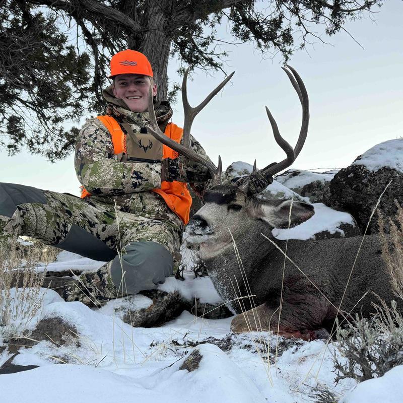 Discouraged and exhausted, we decided to set up a midday camp, enduring the storm and windy conditions of late season Colorado. As the evening approached, my dad and I decided to get up on the ridge that overlooked the cedar flat while Dennis kept an eye on the surrounding area not visible from up top. We had a grueling hike through big boulders and a steep hillside. When we reached the top, the wind was blowing so violently that we couldn’t hear each other from a foot away. We set up and started glassing over the cedar flat. While it was still thick, the height gave us a much-needed advantage. As dark started to approach, I began to lose hope. As I was looking through my spotter, there he was sniffing a doe. I hurried and got my dad on him as I grabbed my rifle. “350 yards,” he called out. I set up and took the first shot. Boom! It was a hit towards the middle of his body. He began to circle around, and I threaded a final shot on him to seal the deal.