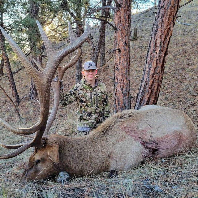 opportunity. Hunting elk is a different level of hunting; it presents physical and mental challenges.I hoped this was the year I would finally draw one of Montana’s most sought-after elk tags. When I received the text from Dad that I had beaten the odds with only two bonus points, I was surprised and excited to have drawn the tag.Football season wrapped up the weekend before rifle season, leaving my weekends open to hunting. My dad is an outfitter and had hunters the first three weeks of the season, leaving limited time to hunt for elk and making me feel anxious that I would not get an opportunity to kill a bull. It felt like the longest three weeks. On opening weekend, I tagged along with one of his hunters, a good family friend, hoping we would find some elk.On our first morning out, we saw a herd of 50 elk with a big 6x6 bull, but we also spotted a monster mule deer. As Dad and his hunter put the stalk on the mule deer buck, it spooked and got away. We regrouped and decided to go after the big bull we had seen. Anticipating that the elk had gone below us, we made our way to higher ground to get a better vantage point, not knowing the elk had also gone high. Catching wind of us, the elk scattered and we could not get a shot.The first weekend we hunted without clients, Dad and I found ourselves in a situation too good to be true – 180 yards from a massive 370" class bull was feeding in a spot that would make the pack out quick and easy. I searched for the bull in my scope but could not find him. The elk bolted as Dad and I realized the scope was still zoomed all the way in from sighting in the gun. Two missed opportunities had me frustrated, disappointed, and worried I was running out of chances.During the first two weeks of August, I hurt my back in football. That injury continued to bother me, making everyday tasks difficult, especially hiking. While waiting for my dad to finish guiding, I decided to go with my cousins to try my luck hunting for a whitetail buck. As luck would have it, I shot a nice whitetail buck with my 6.5 Creedmoor. After loading the deer, my back pain became much worse. Each time I stepped down on my left leg, I felt a burning and pulling pain in my lower back, but I knew I had to push through it if I wanted to have a successful elk hunt.On the fourth weekend of the season, we were granted permission from our neighbor to hunt his property. While we visited in his driveway, he told us about a 7x6 bull he had seen three days prior but hadn’t seen him since. As the darkness faded, Dad pulled out his binoculars and glassed a timber ridge in the distance. To our surprise, five bulls were feeding. Dad said, “The one looks like a big one.” He quickly grabbed the spotting scope and confirmed it was the 7x6 my neighbor had seen. We gathered our gear and took off towards the bulls. We had to cover about a mile of ground and do it swiftly as the bulls were headed for the heavy timber to bed for the day. As we approached the landmark where we thought we could see the bulls, my dad and I began to crawl on our hands and knees. As we reached the top of the knob and slowly looked over, we spotted the bulls feeding into the timber. I gathered myself and got set up, laying prone and using my hunting pack as a rest. I looked through my scope just as the group of bulls was making its way into the trees. I was disappointed and thought we had missed our chance when the shooter bull suddenly started feeding to his right, giving me a window to shoot. Listening to Dad’s instructions, I took a deep breath and took my time gently squeezing the trigger. Through the scope, I saw the bullet impact and the bull drop out of sight.As my bull hit the ground, I felt a rush of emotions. I was nervous, excited, and relieved all at the same time. After waiting a few minutes, we grabbed our packs and gear and made our way up to where the bull had fallen. As we slowly moved closer, I could see the giant beam of an elk horn, and I knew the big 7x6 was mine. After a bunch of high fives, the celebration and photoshoot began. When we finished with the photos, we started breaking the bull down. It was one of the best days I have ever experienced as an outdoorsman. And as an extra bonus, I connected on a really nice mountain lion three weeks later.If I had to use one word to sum up my 2023 hunting season, it would be incredible! I am very fortunate to have had the success that I did. Although I may never have another year like this again in my lifetime, I will surely try and duplicate it. I am grateful to grow up in the mountains and to have all the opportunities to hunt that I do. My dad put a lot of work into helping me prepare and harvest a giant bull. I appreciate all that he has taught me and done to give me this opportunity.Next on my hunting bucket list is to have a successful deer and elk archery hunt and to travel to Alaska for a caribou hunt.