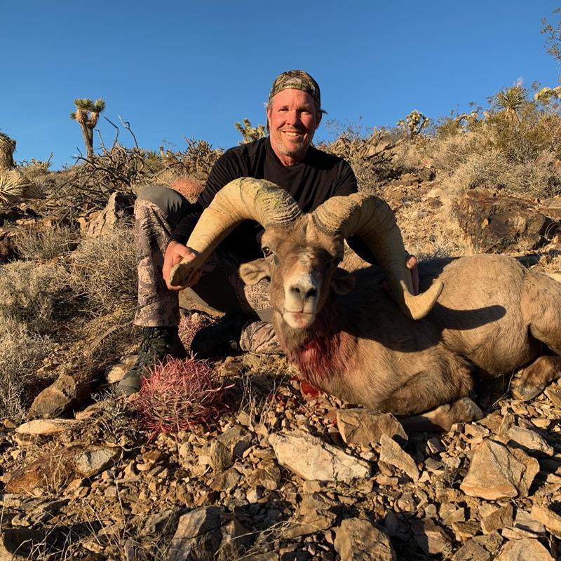 At about one hour left of shooting time, the rams were still bedded. We decided we needed to do something before we ran out of light. We picked up everything and started to move to get a better angle. We walked down the ridge about 50 yards, and Matt called and told us the rams were up. I quickly found a shooting spot where I could lay down in the cactus and got ready again. Then, there they were on the far ridge at 350 yards. From my tripod with my new trigger, I squeezed and watched the ram drop like a rock. I made an excellent shot. I yelled and couldn’t believe after 22 days of hunting I was going home with a nice ram. As I talked over the ram, I called my wife and told her I got my ram. I called my whole family and they sounded as excited as me. They knew how much I wanted to accomplish this goal.