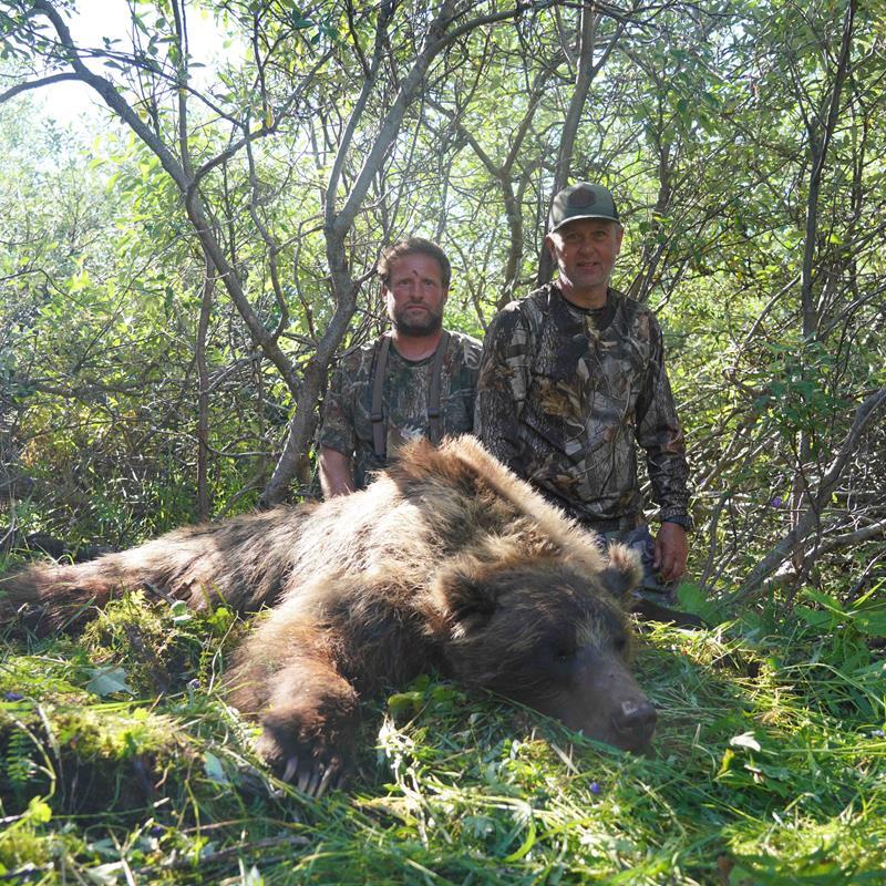 We took the opportunity to remove our waders, cooled down, and then crossed a creek to the side of the bear and climbed a hill to get a better view. After about an hour, Kurt and Aaron started down the hill with guns at the ready. I stayed atop the hill and acted as a spotter. When the two neared the river, the bear was on the move again. Two more shots were fired from the .300 Weatherby, but the bear started to head toward Kurt and Aaron. With an open shot at 15 yards, Kurt was able to put a finishing shot into the animal’s chest. We really could have done without that excitement.