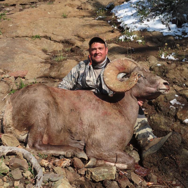 On the way back to the horses, we found a small clearing in the trees about 250 yards below us in the general direction the ram was headed. Meade thought it was a good idea to set up there and wait. After 30 minutes of staring at that opening, Meade said, “There he is!” I had a steep downhill shot at a tiny opening and made it count. Of course, the ram ran straight down the mountain into the drainage that Meade had previously said we didn’t want to get down into because it was such a nasty spot. After a long tracking job in the patchy snow, we finally recovered my ram. A super heavy broomed 9-year-old loner ram was more than I could have hoped for. Thanks to Meade Dominick, Tom Dickens, and Spencer Strike for the hunt-of-a-lifetime. Now leg two of the adventure was on.