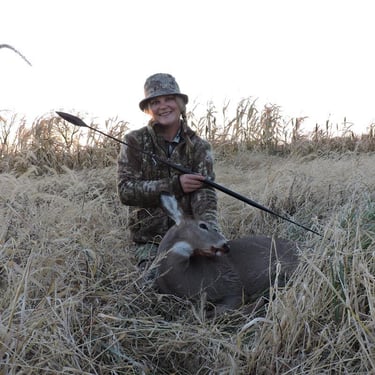 After the immediate cheers and kiss from my husband, we took off to retrieve my deer. We were about 150 yards away, and it took us no time at all to reach the deer with all of our adrenaline. As we got closer to the deer, Gary started yelling and screaming even more, “He’s a good one! Holy cow, he’s big! Three, no five, no six!”