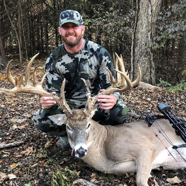 I hunted the next three days with all-day sits but no sign of him, although other deer movement was really good. On Thanksgiving morning, I decided to do a quick sit for a couple of hours before I had to be back home for Thanksgiving lunch with the family. The morning started out pretty quiet, and I had planned to leave at around 9:30 a.m. At about 8:45 a.m., I heard crashing through the woods and it was headed right towards me. I was sitting on the ground behind a GhostBlind as I saw a doe emerge from the brush, running full speed right at me, and then she quickly turned and stopped 10 yards from me. She was panting with her tongue hanging out and looking behind her. I could hear running and grunting coming from the direction she had just come from, but she was so close to me that I couldn’t turn and look for fear that she would see me and bust. Luckily, she trotted roughly 20 more yards into the brush and I was able to turn and look. When I did, I saw the drop tine mega giant that I was after. He was taking a different angle than she did and was quartering away from me. He was still trotting when he came into my shooting lane, and I was trying to stop him, but he was paying me no mind. I knew that I may never see that deer again and it was now or never. I had already ranged all of the trees around me, so I knew the yardage he was at. He was quartering away at 40 yards when I let the arrow fly. I lead him just enough that the arrow penetrated right behind his rib cage and came out behind the opposite side shoulder. I knew it was a lethal shot, and then the adrenaline kicked in along with the reality that I had just smoked a buck-of-a-lifetime.