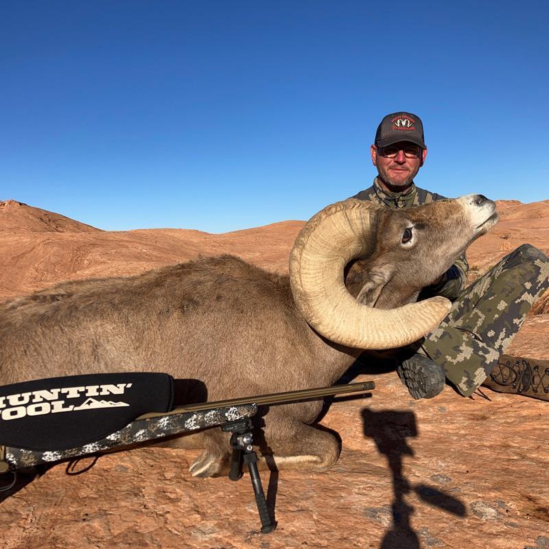 On the sixth day, we moved camp another four miles deeper into the desert to give us access to a specific peninsula that we had high hopes for. The next day, we started hunting down it and found a 6-year-old ram that let us walk within 100 yards of him. Later, he walked up within 50 yards while we were eating lunch. The guides were confident we could find an older ram. It wasn’t long before Alan spotted just this type of ram, but he was across the canyon near where our first camp had been. After a few pics and videos, we decided to go after him. It took us four hours to get all the way around to him. With the sun just above the horizon, we made our final approach. He had moved from the back of a small canyon to the point of a ridge, so it took us some time to find him. As we were walking out to the ridge, we spotted him to our left just over a small rise. He was standing on a sandstone ledge in the evening sunlight. I lay down prone on a rock and could see him clearly through the scope, facing me at 275 yards. I initially waited for him to turn broadside but grew concerned he could bolt at any moment. Feeling confident the gun was solid with a front and back rest, I squeezed the trigger. After the shot, he ran and it became clear I had made a clean miss. Later, I would shoot my gun and realize I had bumped the scope off when I fell. At 275 yards, I would have shot 14" to the right. We tried to find him until dark and then made the long four-hour hike back to camp. That day, we covered 15 miles, most of it on slick rock, and my feet were in bad shape the next day with blisters. Leukotape was a life saver and allowed me to keep going.