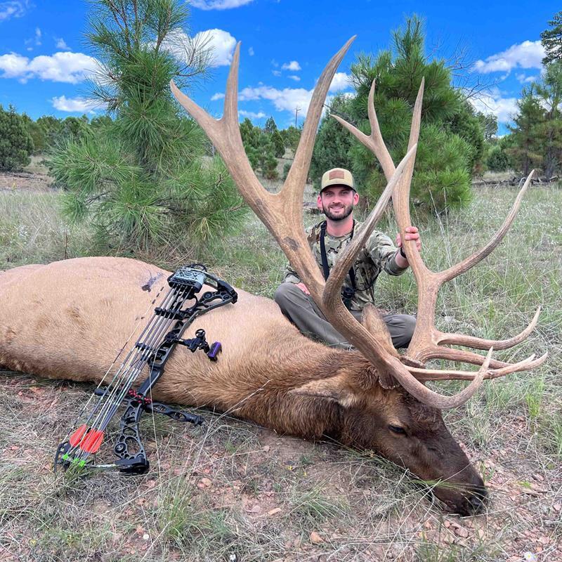 finally arrived, and I was more than ready to get after it. With any hunt, or really anything in life, you typically have some sort of expectations in place beforehand, and my expectations for this hunt were instantly blown away on the very first morning. The amount of big bulls that were screaming in all directions was truly indescribable. It sounded like we were actually hunting inside of Jurassic Park and not a public land mountainside of Arizona. We began hiking out a ridge where we ended up having a super close encounter with a big bull and a herd of cows that were cooped up in some thick cedars. At one point, we were within 10 yards from the cows and could hear the bull screaming just past them but barely out of sight. The cows all stepped out into my shooting lane, but of course, the bull took a different trail and never presented me with a shot. We only caught glimpses of the bull as he worked his way through the cedars and out of our lives. He was big. I think my heart was about to explode with the anticipation of him possibly stepping out for a shot.That evening, we glassed up a very nice bull and guessed him to be around 345". My guide, Eric, advised that I pass that bull and wait for something bigger, so I took his advice and we continued hunting. It was a tough pill to swallow because that bull was probably one of the biggest bulls I’d ever seen.The next morning, we started out in the lower elevation area of the unit and instantly heard multiple different bulls bugling as soon as we stepped out of the truck. It was game on! We took off up the hill in the direction of two different bulls sounding off. Once we got to the top of the ridge, we laid eyes on the first bull down in the valley. He was a mature bull but just didn’t have much going on antler wise. We moved down the ridge in order to get in front of the second bull who was coming right at us based off his bugles. He finally stepped into view at 60 yards, and he was a gorgeous dark- horned, light-tipped 6x6 that probably scored around 345-350". He was screaming his head off. Eric looked at me as though this was my time to make a decision. It was a tough call, but I decided to pass this bull as well. Thank goodness I did.We started our walk back to the truck, and as we approached, we heard another bull bugling on top of the opposite ridge. We, of course, had to go check him out as well. We hoofed it up the ridge quickly, and once at the top, we slowed our pace big time and started stalking into the thick cedars and pines. The bull was close. I eased out 30 yards ahead of Eric and got set up. As soon as I was situated, I looked back at Eric and gave the nod where he then let out an aggressive bugle call and was immediately answered by the bull in the same demeanor. I could now hear the bull walking loudly on the rocks but couldn’t tell exactly which direction the bull was heading. In a matter of seconds, the bull appeared out of nowhere and was already at 25 yards and closing quickly. I instantly knew this was a bull that I would be more than happy to put my unit 3C tag on. He came in so fast that I barely had time to get to full draw. Simultaneously, I mouth called to stop him. He stopped on a dime, but I was a half second too late and the bull stopped just barely past my only shooting lane. My 20-yard pin rested firmly on his back legs. I didn’t have a shot. The bull spooked and trotted back down the hill in the direction he had originally come. I was devastated. Luckily, the bull got about 200 yards away from us and started bugling again! We watched him go up the opposite ridge from us, bugling the entire way up the hill. We planned to back out and let him go to bed so that we could come back that afternoon and try our luck again, until a second bull started bugling alongside him. They started going nuts! Eric then decided we’d better just stay on the bull’s trail and try to make it happen right then and there. Game on.We pursued up the same ridge the bull was on, easily going in the right direction due to the constant bugling and sounding off from both bulls, allowing us to pinpoint their exact location. We stalked in close and got to about 60 yards from both bulls, only catching glimpses of the bulls zig-zagging through the thick brush. They were now both in view. Eric and I tucked in close to a cedar tree and waited for a shot opportunity. Both bulls were slammers, easily pushing the 350" mark. I told myself that I was going to shoot whichever bull gave me a shot opportunity first. The bulls circled each other, constantly bugling and stopping to thrash their horns in the trees. One bull even trashed his horns into a downed log, and with one swift neck turn, he flung the log six feet into the air! I was starting to wonder if I needed to be hunting with a hard hat on. Now the bulls were walking side by side from right to left, coming directly into my shooting lane. I came to full draw, waiting for Eric to give me a range. In somewhat of a state of panic, Eric informed me he could not get a range on them because of all the brush that was in between him and the bulls. I guessed the closest bull to be about 40 yards away. I mouth called and stopped the bull in his tracks, holding my 40-yard pin firmly behind his shoulder. I squeezed off on my release, letting the arrow fly, and watched as the last little bit of my orange fletching disappeared right into the crease of the bull’s shoulder. It was a perfect shot and went through him like butter. The arrow even stuck 2" into a pine tree after the pass- through, which was pretty crazy to see.There is no question that this was truly a hunt-of-a-lifetime for me. Once again, I cannot thank Huntin’ Fool enough for helping me draw this elite tag and pointing me in the right direction on which outfitter to book with. I ended up booking with A3 Outfitters, and they were absolutely top notch from beginning to end. My guide, Eric Fish, knew the unit like the back of hi