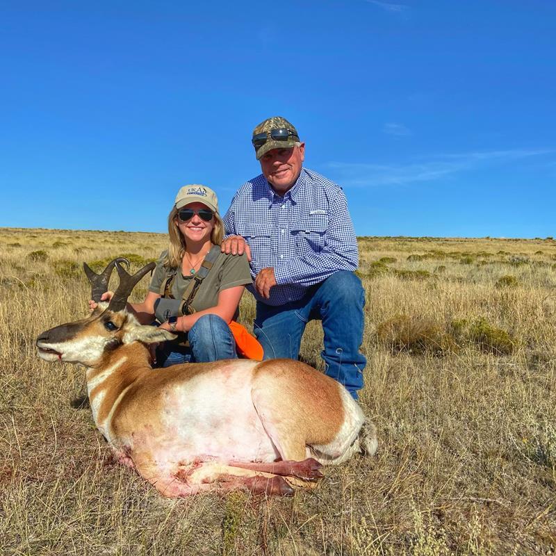 Upon arrival at the ranch mid-afternoon on opening day, October 1st, our host, JD, suggested we get unpacked and meet him at his ranch house in about an hour. At the agreed upon time, we met up with JD and began our search for a suitable buck antelope for Alden. It didn’t take long as within minutes, JD spotted a “shooter” buck in one of the large grassy pastures. After several attempts to get Alden in position, she successfully made a “belly-crawl” stalk through the tall grass and cactus to within 75 yards of the trophy buck. After a couple of off-hand shots, she had her antelope on the ground and was ready for pictures.
