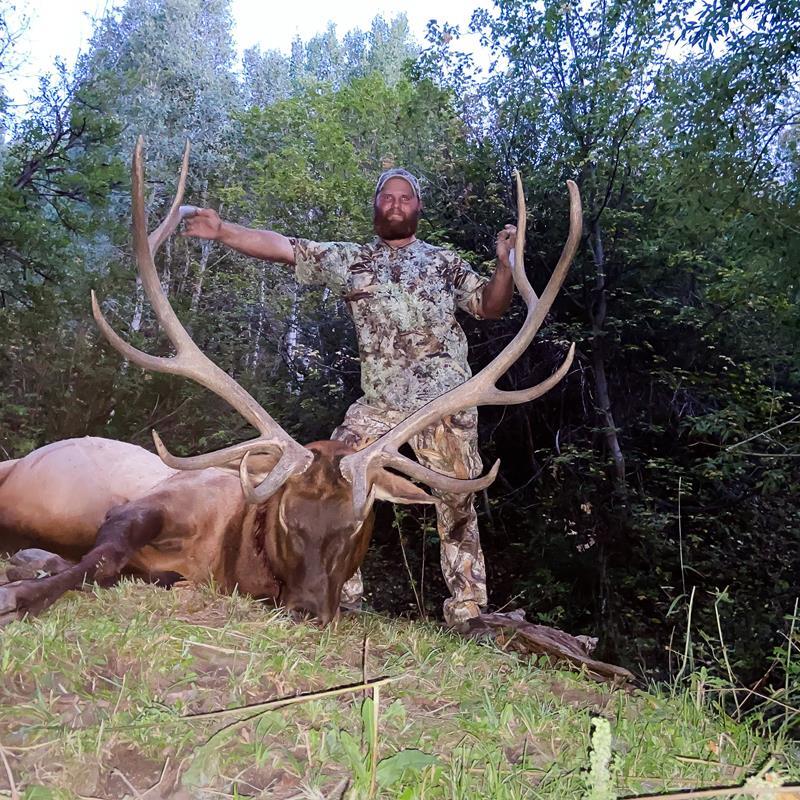 When I got to the opening, I slowly started to draw back. He lifted his head and looked right at me. I knew this was my chance because if I waited, he would bolt. I quickly put my pin on his chest and let it go. I knew the shot was good as I watched the fletchings bury into him. The bull immediately jumped from his bed and took off down the mountain. As I started to track, I called my dad and told him I had just shot. He told me he had watched the bull run through a small opening back into thick brush and guided me to that spot. When I got there, the blood trail was getting heavier. I knew he couldn’t be more than 100 yards. I got down to a drainage in the bottom of the canyon and found my bull piled up against a tree. I called my dad, and with all my emotions, all I could get out was, “I’m done.”
