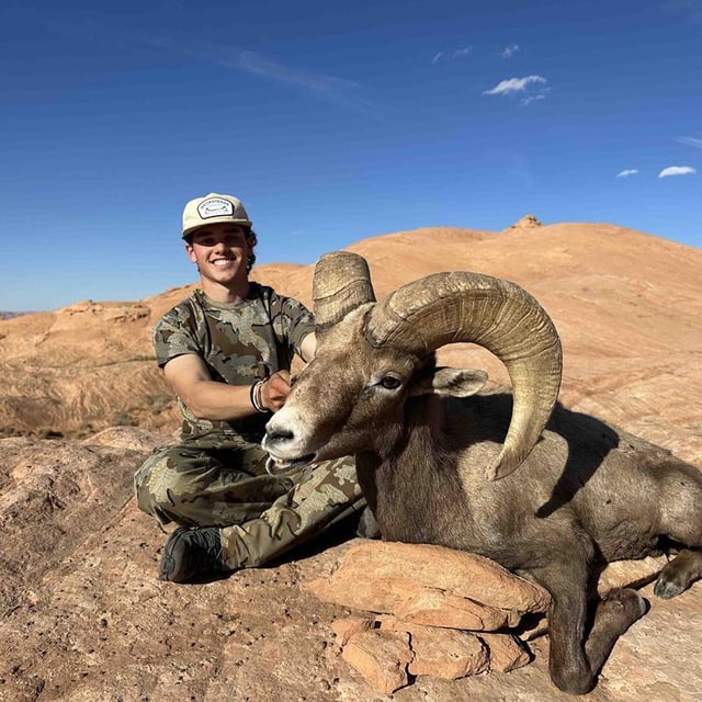 five-hour drive, I met my buddy and we headed out on the dirt road. After a three-hour grueling dirt road ride, we were able to get into what looked like good sheep country. We set camp and then headed out the next morning.The first morning, we were able to pick out a ram and a few ewes, but I never got a great look at him. However, I knew he was a nice, mature ram. We planned a four-hour stalk, and I was able to get within 40 yards of his ewes and 60 yards from the ram. The ewes ended up busting us, and the ram slipped out from under me. After two more days and over 20 hard miles of hunting this ram, I was starting to have thoughts of picking up my rifle, but my goal was to make it happen with my bow no matter the cost. I eventually knew it was time to give this ram a break, and we decided to pack up and head into a different area.After we moved areas, we started glassing and my buddy found “The Ram” bedded under a little ledge. I hurried over to see him, and we soon came up with a stalk that I’ve never quite seen done before. I had jokingly said, “I’ll come right above him and shoot him at 2 yards!” We then decided that was probably the best play because of the wind and the way he was laying. I stalked in, and after a couple of hours, I saw the rock outcropping that he was laying under. I knew I was getting close. My nerves were kicking in hard at this time! I slipped my shoes off and tucked my pant legs into my socks to be quieter. I then waited for the ram to lay his head down and I closed the rest of the distance for the final approach. I drew back my bow and peeked over the ledge. I saw the ram laying there at only 2 yards! I don’t think I have ever been more nervous in my life. The ram was laying facing to my left and I was right on top of him, so I put my pin right between his shoulders and let it fly. He quickly got up and ran roughly 40 yards before tipping over.This was a moment that I had always dreamed of, and to think it had just happened was incredible. It is one of the highlights of my life, and it’s a moment I will never forget. One thing I know now is that hard work really does pay off. I’m beyond blessed with the way this hunt turned out, and I wouldn’t have wanted it any other way. A Utah ram with a bow at 2 yards, it doesn’t get much better than that!