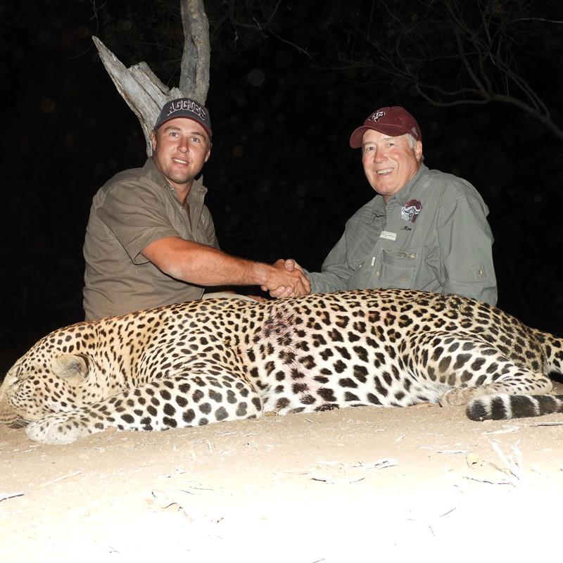At 6:07 p.m., the cat stood up and Garth gave the all good. At the shot, the leopard fell out of the tree. We had about eight minutes of light left in a 14-day hunt. The guys had heard the shot and the whomp of the hit, and they were very excited. We drove across the river and prepared our retrieval. This would be the dangerous part of the hunt. We carefully approached the bait tree, looking all around in the grass and brush. Finally, we looked directly under the bait and found a pool of blood and a strong trail leading away. Garth cautioned us as a wounded leopard does not give any warning, no growl or roar like a lion, just a lighting fast charge, which can cause damage requiring 100 stitches for every second he is on you. That will keep you alert and wary! It took us 30 minutes to cover 50 yards, following the trail until we reached the long grass along the river. We decided to follow the edge rather than enter the difficult long grass. Suddenly, Garth jerked around and pointed his gun with the flashlight. There lay the magnificent leopard. A couple of rocks were tossed his way and then the celebration began.