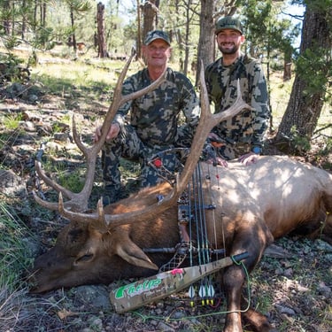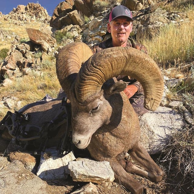 I decided to finally apply. The security that came with sheep points in “my back pocket” afforded me the opportunity to pursue other big game goals and adventures with the intention of a Wyoming bighorn sheep hunt as a grand finale to a great bowhunting life.Eleven years ago, with maximum points, I drew a tag for Wyoming Shiras moose in Huntin’ Fool’s top-rated unit. A successful hunt completed my archery moose slam. I owe much to Huntin’ Fool founder Garth Carter and the Huntin’ Fool staff. Garth sent me a letter in 1995, inviting me to become a member of Huntin’ Fool. He offered to do all the legwork necessary to keep on top of all the great western hunting opportunities. This education and Huntin’ Fool’s constant nudge to build points has been the pathway to my experiencing some of best hunting North America has to offer at an affordable price. My advice to young hunters through the years has been the same as those of Garth Carter, “Apply, Apply, Apply!”I finished my archery elk slam on August 7, 2019 with a Tule elk in Santa Margarita, California. A month later, in the Brooks Range of Alaska, an archery kill on a Barren-Ground caribou completed my caribou archery slam and the Archery Super 25. Now it was time to be all in on Wyoming bighorn sheep. I decided that I would put in the draw for a 2022 Wyoming sheep tag. I was looking for the best outfitter, a unit with a lot of sheep, great bowhunting terrain, and mountains a 64-year-old arthritic bowhunter could handle. With plenty of public land, very suitable bowhunting landscape, ATV trails to the top of most mountains, and advice from successful unit 17 resident sheep bowhunter Vic Dana and Huntin’ Fool’s Robert Hanneman, I settled on unit 17. Robert also recommended Chance Marshall and his father, Kevin, owners of Extreme Outfitters, as the best to guide me.With a ram tag in my pocket, it was game on. I arrived in camp on August 14th, one day before the start of the Wyoming bighorn sheep archery season. Chance and Kevin were out scouting for sheep, and the pictures of dozens of mature sheep they had been sending me were nothing short of incredible. When Chance and Kevin arrived at camp, they informed me that most of the rams were on the highest mountain, the one with no ATV trail to the top.The first day of hunting was both exhausting and exhilarating. The trudge to the top of the mountain was tough for me. The sheep were not where Chance and Kevin had left them the afternoon before. It took several hours of up and down backpacking and patient glassing before we found the sheep. What a sight with 29 rams 500 yards below us in a drainage! With all the unbeatable sheep eyes and ears and the need to get within bow range, we nixed the idea of trying a stalk. Reluctantly, we left this group of awesome rams in search of one in a stalkable location.Within an hour, a great sheep was spotted, and I found myself inching my way toward a very nice, bedded, full curl ram. As I advanced toward the bedded monarch, there was no way I would not be heard. He looked my way often, and with each look, I became a statue. “Embrace it or go home,” I admonished myself. Finally, I made it to the small spruce tree that had kept me from full exposure. I ranged the bedded ram at 55 yards. I wanted to get closer, but that was impossible. The great ram eventually stood, turned, and walked directly away from me down the mountain. No shot.Back at camp, I was exhausted. It took all I had to get off the mountain. We decided to hunt the “low” country for the next few days, allowing me to recover. It was hard not to return to the sheep on the high mountain, but it was the right call. Chance was prepared to bring in horses if needed. That night, he made the arrangements.We had no trouble finding mature rams throughout the “low” country. I had daily stalks, but 55 yards remained the bowhunting wall. Getting closer was just about impossible. I was discouraged, but I should not have been. The opportunities and big rams far exceeded my greatest hopes and expectations.Day five arrived. Before light, Chance was off to town to take care of some business and Kevin and I headed out on the side-by- side. The horses were arriving today, and tomorrow, we would be back on the high mountain. As soon as the sun peaked above the picturesque mountains, Kevin found sheep. It was the big full curl I had stalked on day three. He and a younger ram were bedded. Again, I stalked to within the permitted 55 yards only to get busted.We decided to head back to camp and help with the horses. They arrived later than expected, and by the time they were settled, there were about two hours left in the hunting day. Kevin suggested we hunt close to camp. We geared up, and soon we were headed up the road traveled by campers and fisherman rather than the ATV trail we had been using. We were only 10 minutes from camp when Kevin exclaimed, “Sheep!” Rather than stop and possibly alert them, we kept the side-by-side moving. We stopped around the next bend, out of sight of the sheep. We conferred and assessed that about 10 young rams were 75 yards above the road on a very steep, rocky slope. We decided to drive past the group to further assess. On the second pass, we saw two beautiful, big rams bedded together below a sheer rock face with the group of young rams. Both were great rams, with one a full curl and the other a heavy, broomed 3/4 curl. We kept driving. Once out of sight, we stopped, checked the wind direction, and made a plan. The young rams fed their way parallel to the road. The wind was perfect if I could climb up into the rocks in the hopes of an ambush from above.I labored to climb the steep, rocky slope and found a flat, comfortable rock behind a black boulder and sat down to wait. No sooner had I assessed the likely ranges, nocked an arrow, and dug my heels into the steep slope than I saw the first sheep. As I crouched and pressed tight to the boulder,