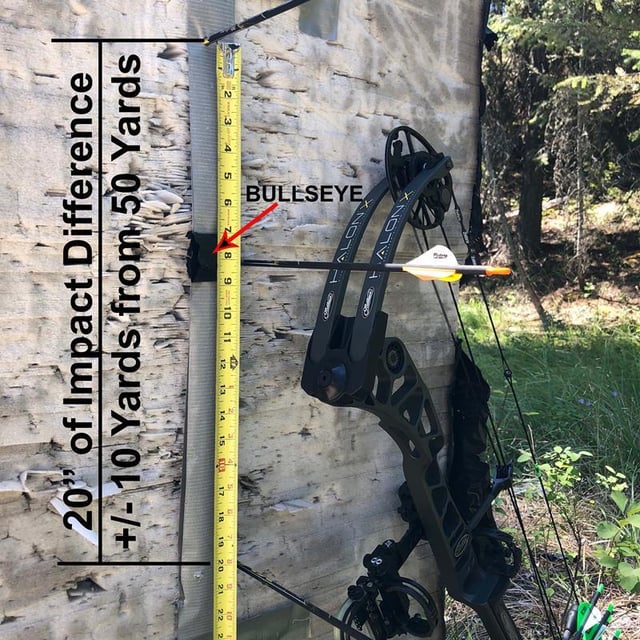 To drive this point home, I’ve included images that illustrate my own testing results. All of the arrows in the included images were shot while aiming with my 50 yard pin at ranges from 40 yards to 60 yards. One image shows how my impact point changes while being off +/- 5 yards, and the other two images illustrate the painful reality of being off by +/- 10 yards. As illustrated, my arrows impact 12 inches low at 60 yards when I aim with my 50 yard pin. For the record, I shot a 410 grain arrow at 292 feet per second in these tests. I also shot at least five arrows from each yardage to establish an average location for the photos.