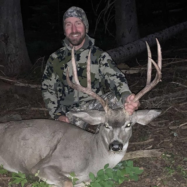 We were set up in another field of blowdowns, and the wind was howling. It was so strong that we could hear trees crashing all around us. Over a dozen widow makers had come crashing down, and eventually, one came down that was too close for comfort and we decided to head back through the dark timber towards camp. We were walking quietly, not expecting to see anything as the light faded and the wind whipped, but the wind helped conceal our noise and is likely the reason we were able to get within 20 yards of two bedded mule deer bucks. They both jumped up, with one trotting down and to the right just enough to be hidden by the forest. The second buck went 10 yards and turned back to give me a final look. I ranged him, drew back my bow, and then let off. Did I really want to shoot this buck on the third day of a week-long hunt? I'd more than likely be giving up my chance at an elk. It didn't take me long to decide. He gave me a steep quartering away shot, which I was able to make behind the last rib and through the heart. He bolted downhill. I was confident in my shot, but the confidence starts to slip as you replay the shot in your head while you wait.