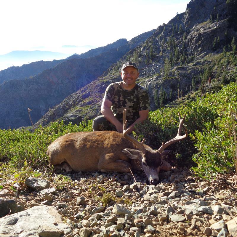 On day two, Tommy and Ryan decided to sleep and rest their legs. I decided I was going hunting. I left in the dark, as we normally do. An hour later and still in darkness, I was at the spot where I wanted to be. As soon as first light hit, I spotted a buck at the bottom of the canyon at about 450 yards. He was moving fairly steady on a trail as if he was already heading for his bedding area. He was a mature buck with decent mass and eyeguards. I could make out four points per side, and that’s all I needed. I hadn’t shot a blacktail buck since 2012. I quickly found a large, flat rock to prone out on. I made the quick adjustments on my scope for the shot. The deer just kept moving. I held for the travel time and squeezed off a shot. The deer made a quick turn downhill and went into some thick manzanita brush. I knew I had missed him. I scanned the brush and could see him looking my direction. I had a frontal shot of his chest. I squeezed off a round, and down he went. I made my way to the buck and was happy with him. I’ve shot many that would score better, but this was still a nice buck. He had decent width and mass with eyeguards.