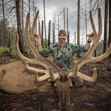Sitting next to a small ponderosa, we caught movement of a massive 6x6 approximately 250 yards up the meadow working his cows. In the meantime, a smaller satellite 250" 6x5 ran directly into our cow calls broadside at 55 yards. I elected to pass being only an hour and a half into a weeklong hunt and already seeing multiple bulls over 300". We held this position for another hour, admiring this big 6-point bull bugling and gathering his cows. The bull slowly reached the top of the hill and jumped the barbed wire fence, skylining his impressive antlers. To his left, a new 7x7 bull we had yet to see made his way towards the massive 6-point. They crossed paths multiple times, staring at each other. They squared off, tilted down their heads, and charged! A loud blast of bone echoed amongst us. I was in shock to witness two 300"+ bulls fighting less than 200 yards away.
