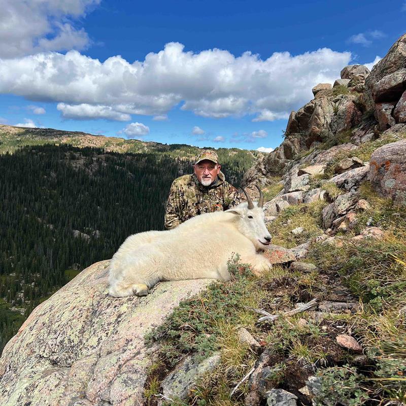 point of Elliot Ridge, the wind was blowing at least 40 mph and it started sleeting. I pulled my rain jacket from my saddle bag, but not gripping it tight enough, the wind blew it over my horse’s head. He was already nervous from the pelting sleet, and this just set him into panic mode. A seasoned horseman could have salvaged the situation, but once again, he tossed me. My left foot did not come out of the stirrup right away, stretching my leg and tearing my hamstring. Tom and Lloyd managed to get me on the horse Tom had been riding, and we rode the remaining two miles to our campsite.We got our tents set up, and I tried to rest while they glassed for goats, but it was difficult even trying to get comfortable laying down. The following day, I was sore. My entire body hurt, but I wasn’t about to throw in the towel. We wrapped my leg really tight with ace bandages, and I could actually walk stiff-legged. I glassed from camp as Lloyd went higher up the ridge for a better view. He spotted three nice billies about three miles away in some really rugged cliffs. The odds on this hunt were definitely stacked against me.Later that afternoon, I spotted three goats, a young billy, an older nanny, and a kid, about two miles from camp in some milder terrain. We decided to try for the younger billy, so we made a plan for the next morning’s hunt. We left camp at 3:30 a.m. since we were not sure how long it would take to get me into shooting range, if it were even possible. Most of the walking was downhill to the valley floor, which made walking for me much easier. We reached the bottom well before shooting light, set up spotting scopes, and waited. It was still so dark that I could hardly see anything. Then Lloyd said the magic words, “I see them, and they have dropped halfway down from where they were last night.” That was great news as we could move a few hundred more yards and maybe get a shot without climbing.We slowly worked our way to the base of the mountain but lost sight of them due to the rock outcroppings. We backed out and spotted them bedded at 260 yards. All we could see were their heads, so we got me set up and once again waited. After only about half an hour, they stood and started walking to our right, which would put them in a perfect spot for a shot. I had my rifle set up on our packs, and I was steady but not comfortable. The position I was in had my hamstring cramping, so this needed to happen quick or I would have to move. The nanny came through first, and she had 9 1/2 to 10" horns, but she had a kid, so shooting her was not an option. This was an either-sex tag. The billy came through next, and after a 100% conformation from Lloyd that it was the right one, I slowly squeezed the trigger. The shot hit him hard but did not put him down. He dropped down about 40 yards and stood at the edge of a 500-foot drop. I had to completely readjust, and my leg was killing me at this point. I rushed the second shot and hit the rocks right over his shoulder. The third shot was true, and he went straight down only inches from the cliff’s edge. My biggest fear on this hunt was him falling into the abyss and breaking his horns. I had watched too many goat hunting videos. He wedged in some rocks and stayed put.After high fives and hugs, we sat down and took in the moment. Lloyd had done the impossible. He got me on a goat in the shape I was in and we made it happen. Lloyd is a genuinely great guy and a true alpine expert. He was patient with me and never pressured or rushed me. He offered to retrieve my goat while I waited at the bottom, but that was not going to happen. I had to put my hands on it right where it lay. It took some time, a lot of time, but he got me up to the 11,500-foot mark where my prize awaited me. He was a beautiful specimen with a really nice coat for that early in the year and sported 8 1/2" horns. He was a young goat, later aged at only 2 years, but I could not have been happier. It was a true blessing that I got to hunt at all, let alone take such a nice goat. My body was in bad shape, but I got it done and managed to take a 6x5 bull elk with my muzzleloader a few days later. This is one trip I feel that I honestly beat the odds.