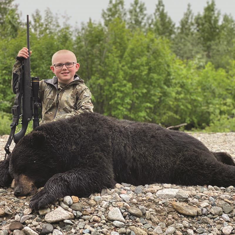 Going to Alaska is a big step for any hunter. I’ve been fortunate to go on many hunts with my family but never my own adventure. This summer, my dad surprised me with my first Alaska hunt. We would be hunting black bear with Jonah’s Alaskan Adventures by Super Cub!On the flight in, we saw beluga whales and some bears along the coast. After setting up camp next to the plane, we went to sit the bait. The first night at the bait, all we saw was a young grizzly that would not leave.The next morning, we snuck into the bait and there was a bear already on it. We started easing up slowly until we got up to a dead tree where I could rest my rifle. Jonah told me to put a round in the chamber. I was just about to pull the trigger when the bear disappeared into the trees. Seconds later, an even bigger boar stomped into the clearing. My dad and Jonah said to take him. I took my time and nailed him behind the shoulder. He ran into the timber, and seconds later, we heard the death moan. He only went 5 yards. I could not believe my luck! The bear turned out to be 6’4" with a perfect hide. It was an old boar Jonah had been trying to get all season.After we got the bear skinned and packed back to camp, I called my mom and grandpa on the satellite phone and told them the good news. Luckily, this is a two bear area and I would be able to take another bear.Later that evening, we went back to sit the bait again. Jonah spotted a bear right away, but it was just a little sow. A little later, a big bear eased out of the timber. The bear looked big, so we decided to take it. After steady aim, I shot again. The bear bolted into the trees and disappeared. We waited a few minutes to start tracking. The blood trail was good, but the bear went a lot further than we thought it should. While tracking my bear, we ran into a young grizzly and Jonah had to fire a shot near him to get him to leave. After about 300 yards of tracking through the thick brush, we finally found the bear. My shot was a little low, but it did the job. My second bear was a beauty as well. We skinned it on the spot. The bugs were terrible and made the job really hard.After we got back to base camp, I asked the most important question I had ever asked in my life, “Can we have s’mores and a fire now?” Jonah said yes as soon as I asked. When I got the fire going, Dad and Jonah started telling old hunting stories as the sky light faded away in the darkness. We heard some wolves howling and had a great night.The next morning, we loaded the plane with all our gear and two extra bears and flew back to the hanger. I had a great time playing with Jonah’s son, Miles, who is my age.The next day, we drove to see my dad’s friend, Frank Sanders, to try to catch some halibut. When our boat came, I was amazed by its size. It was huge and called “Unforgiven.” Frank is a famous captain known for catching big halibut. He took us eight miles out to sea, and I got to drive part of the way. When we got there, I learned how to bait and cast a deep-sea rod. After I learned how to cast, I felt a tug and then I flipped the switch and reeled as fast as I could. It felt like the world record, even though I knew it wasn’t. When I got the fish in the boat, Dad told me good job.After one minute, we couldn’t stop reeling in fish. I caught two more fish, and my dad caught one more fish. Then it hit me. I felt a huge tug and knew the fight was on. When we pulled the gigantic fish out of the water, Frank grabbed the .22 and told me to shoot it, so I did. Later, we found out that it weighed 60 pounds. All together, we caught about 30 fish in an hour. When we had to go, I said, “I am always going to remember this trip. I know it.” That night, we processed all the fish and I learned how to vac seal. I guess coming home with two bears and 60 pounds of halibut is about as good as a trip gets.I would like to thank the Stewart family for inviting me to hunt, Frank Sanders for taking us fishing, the Kronberger family for showing us around, and the Shaffer family for dinner. I also want to thank my mom and dad for always giving me great opportunities!