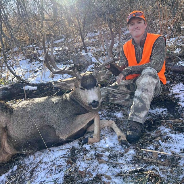 Pennsylvania to Colorado and arrived a couple days early to do some scouting. We scouted a couple new places I had e-scouted but ended up hunting the same place I had hunted previously.We hiked in on opening morning to be in our spot we had picked before daybreak. Right at daybreak, we spotted three bulls (we both had elk tags as well). They were out of range and right on the edge of private land, so we decided to watch them to see if they came off private onto the public land. While watching them, I had glassed some smaller mule deer bucks and does. Then, at 10:30 a.m., I spotted a big buck in thick brush. I kept him in my spotter and never took my eye off him. After watching him for a while, he ended up bedding for 20 minutes. I had my gun set up, ready to go beside the spotter for when he stood up. I only had one small hole I would have a shot at him in when he stood up.Finally, the buck stood up and stepped right into the hole I needed him to and stopped. At 12:08 p.m., I was able to take the shot at 676 yards and dropped him. I got the whole thing on video through a digiscope setup on my spotting scope.We packed up and started hiking toward him. We got to him an hour and a half later. My excitement was through the roof!! We spent the rest of the day packing him out. This was my biggest buck and such an awesome experience. Unfortunately, that was the only tag we were able to fill. We just couldn’t glass up anything worth pursuing after that, but it was still a great hunt.I forgot to mention that it was my birthday when I killed the buck. I also forgot to mention that my daughter, Huntleigh, had picked which bullet I was going to use to shoot my buck, so that must have been my lucky one.