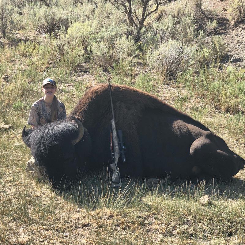On May 13, 2020, my brother, Braden, my sister-in-law, Rylee, my sister, Morgan, and I received this text from my dad, “One of you four is the lucky winner of a once-in-a-lifetime tag. Not sure which one yet. Braden – goat, Morgan and Rylee – moose, or Sydney – bison! What one will we be hunting? Who knows, but one of them!” After that day when the credit card was hit, we were anxiously waiting for the results to come in. The next 48 hours were excruciatingly painful, but finally, the results came in. At the age of 14, I had drawn the once-in-a-lifetime, any weapon, either-sex bison tag for the Book Cliffs area. When my dad told me this news, I couldn’t help but jump for joy!Now that the reality that I would be hunting bison in a few months had set in, I knew that I had to start preparing right away. I started out target shooting with my dad’s Savage .17 to get used to finding targets in the scope and being comfortable loading and unloading a bolt action rifle. Next, my dad and I decided what caliber I should use. We finally decided on the Browning Hell’s Canyon LR .300 Win Mag. Now that I had picked the perfect rifle, we began to scout.During the summer months, we took countless trips down to the Book Cliffs in search of bison. We searched high and low from Steer Ridge to Woods Canyon hoping to find the bull of my dreams. During our many scouting trips, we saw a lot of bison. One of the first bulls we saw was on Steer Ridge, which we named “Bruce.” He was a good, mature bull, but his horns were pretty broomed, making him a little smaller than the bull I was hoping for. With Bruce on the back burner, we continued to search for my dream bull. The next mature bull that we saw we named “The Gorilla Bull.” When we first saw him, he was on a trail camera on Cherry Mesa. We knew that we needed to get a closer look. We covered a lot of ground and finally spotted him. This was a very good bull. We didn’t think that there could possibly be a bigger bull in the unit. That is, until we saw “Bruiser!” When I first laid eyes on this monster, I knew this was the bull of my dreams.After we saw Bruiser, we came back to the same guzzler where we first spotted him, and much to our surprise, he never moved. I was so excited. As the hunt got closer and closer, Bruiser stayed within a quarter mile radius of his water source. As opening day rolled around, I figured this hunt would be a breeze. We snuck into Bruiser’s guzzler, and immediately, I was shocked. Bruiser was gone! We looked for him for a while, but he was nowhere to be seen. Feeling discouraged, I decided to look for The Gorilla Bull. After a short time, we found him and I set up multiple times, but every time I put him in my crosshairs, all I could see was Bruiser. Knowing The Gorilla Bull wasn’t going anywhere, we decided to go after Bruiser one last time. We drove down every canyon and every draw we could think of, and finally, down a long, deep canyon all alone, we found Bruiser.I quickly jumped out of the truck, and in what seemed like a second, my dad set up the tripod and I found Bruiser in the scope. My dad ranged the bull and said, “348 yards.” I put my sights behind his front shoulders, took a breath, and slowly squeezed the trigger.My brother, Braden, yelled, “You hit him good. Shoot again!”I quickly kicked in another round and shot again. “You hit him again!” Braden said.“Shoot him again!” my dad cried.I loaded the last shell into my gun, and with my final shot, the giant fell. After I finished shaking and jumping in excitement, we walked up on a true giant of a bull. I had killed the bull of my dreams; I had killed Bruiser.