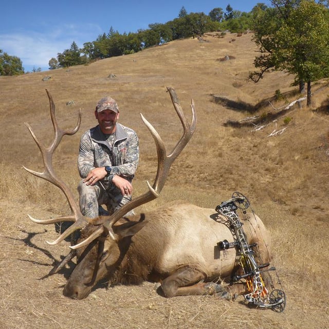 On the first morning, we heard some great bugling and glassed up several nice bulls, but we decided to pass on all of them. It was late morning and we were hiking along and sharing stories about past hunting experiences when all at once Cary stopped dead in his tracks and said, “That’s him!” I got my binos up just in time to see a really nice bull and four cows go over the ridge. We were not sure if we spooked them or not, so we decided to take it nice and slow hiking up the ridge to see if the bull stopped in the canyon or if he headed off to the next zip code. We had to belly crawl the last few yards to remain undetected, and that is when I was introduced to these thistle bushes that had to be planted by the devil himself. These plants had needle-like spikes that would poke you in your hands, knees, legs, and anywhere else that was close to the ground. We managed to get to the top (after using several words that would make a seasoned sailor blush), and to our surprise, the bull and all four cows were grazing just on the opposite side of the canyon. We retreated over the ridge, took cover, and started calling. We were in a perfect spot, and the wind was right in our faces. We could not have drawn up the setup any better! That big ol’ bull ignored Cary’s first few bugles, but after a few minutes, he could not stand it any longer and roared back at us. He refused to move, but at least we knew we had his attention now. Over the next half hour, despite our best efforts, the bull would not move. Cary has years of experience with these bulls, and he knew exactly what to do next. He and Jeb backed down the ridge and got further away from the bull and fired up the calling again. Thinking his cows were being stolen, our bull got motivated and the next time he bugled he had moved over 100 yards closer to us. He kept walking, and in the blink of an eye, the bull was 8 yards from me, looking straight down the canyon toward Cary, and he had no idea I was even in the world. Standing next to me, he let out a bugle so powerful that I swear he slung snot on my hat. It took me a few seconds to collect my composure so I could draw back my Mathews bow and send an arrow in his direction. The bull had no idea what happened as he whirled around and walked off a few yards only to give me another shot. I knew I had a good hit with the first arrow, but anytime you have a chance to send a second arrow in a bull this large, you do it. After the second arrow ripped through the boiler room, he stumbled down the canyon and lay down. Cary and I decided to hike back to camp, have lunch, and come back in a few hours.