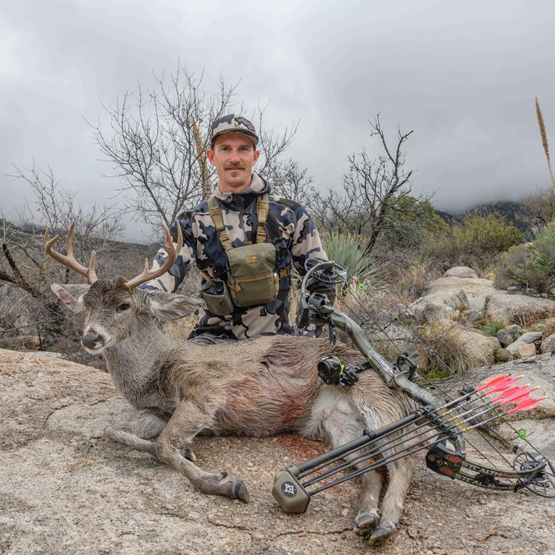 When I returned to the trailhead, it was pouring rain and the sun had just set. I didn’t anticipate rain, so I was only packing a rain jacket and no rain pants. As you can imagine, I was completely soaked from the waist down by the time I made the two-mile pack in and set up my tent for the night. Good thing it’s Arizona and even our winter nights aren’t very cold. I awoke several times during the night to hear the pounding of rain on my tent. About an hour before daylight, the rain stopped and I pulled on my cold, soaking wet pants from the night before and crawled out of the tent. I was greeted with a layer of thick fog for the first hour of daylight. Deer activity seemed slow from the storm that had passed in the night, but there were a few does feeding nearby. I spotted a buck after some time behind the glass just 250 yards from my glassing location, walking a ridge away from me. I decided to see if I could rattle at him and get him turned around. I hit the rattle bag, and instantly, he switched directions and dropped into the canyon that separated us. I cut 40-50 yards and set up with an arrow nocked, but the buck eventually lost interest and I spotted him feeding away again.