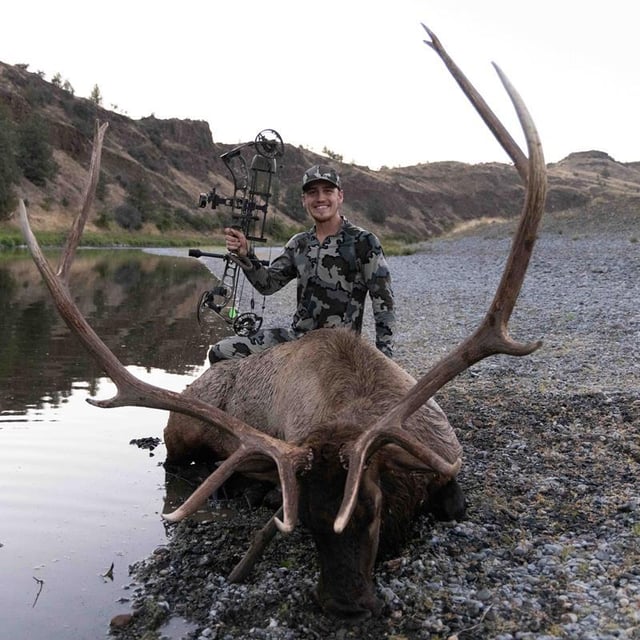 I pulled back my bow, knowing this was going to be the buzzer- beater shot of this long week leading up to this very moment. I put the pin right in the middle of the lungs and released my arrow. As I saw the arrow fly, I knew it was perfect. We saw the arrow punch right through the lungs, and it made the best sound. The bull stumbled into the river and sank, which was the most amazing thing I had ever seen. I was overwhelmed with gladness. I had to swim across the river to then pull this bull to the other side to start gutting it. Putting my hands on this bull and his horns was awe-inspiring.