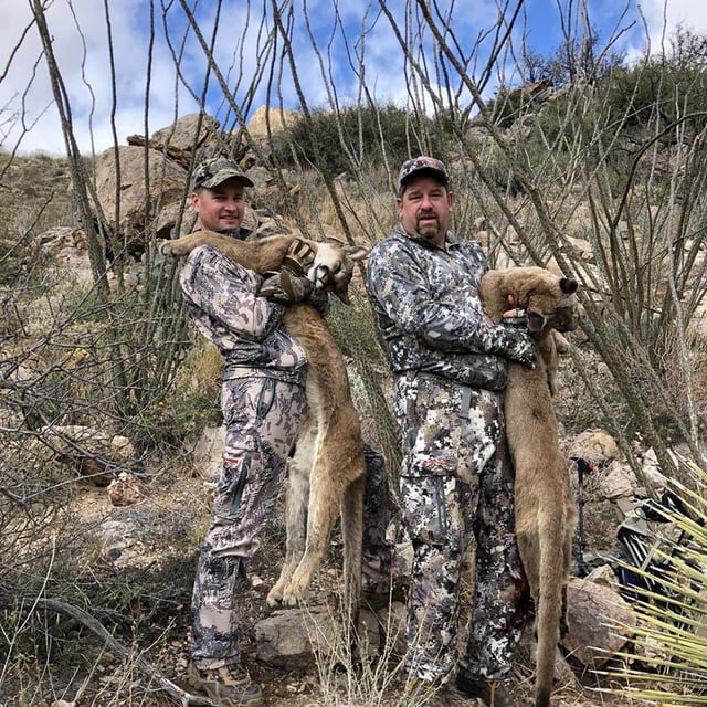 Arizona hunting adventure. I called Diamond Outfitters to finalize our plans for the trip. While talking with them, I asked about other hunting opportunities in Arizona. I was surprised to learn that mountain lion tags in our area were $75 over-the-counter. Dan told me they occasionally see them while hunting and there were no additional trophy fees for them while on the Coues hunt. Ron and I both thought that for that kind of deal, why wouldn’t we have that tag in our pockets? We stopped in Tucson on our way to meet our guide and added mountain lions to our list of possibilities.We set out to meet our guide, Nick Morris, southeast of Tucson. Our hunt was in unit 36C, which borders Mexico. When we met up with Nick, the first thing he told us after his name was, “If you wander off alone, make sure you bring your firearm with you.” This got our attention. He said, “We may see illegals, but more than likely, at some point we will see smugglers.” Ron and I looked at each other and thought about how that wasn’t in the sales pitch, but we were still eager for our hunt. The rest of day one consisted of shooting our guns and a short scouting trip to a couple of spots we would be hunting.On morning one, we hiked up to a ridgetop and started glassing at first light. After about an hour or so, we were only spotting does, so we hiked further up and over to the next ridge. We continued glassing, and Ron spotted something. A cat?Nick asked, “Does it have a tail, or is it a bobcat?”Ron said, “It’s got a tail!”All three of us started glassing the area. Nick found it in his spotting scope and said, “There are two of them, and they are chasing a deer!” The mountain lions were over 2,000 yards away on the far side of the bowl we were glassing. Both Ron and I immediately wanted to go after them. Nick, being the voice of reason, let us know it was a long shot. However, with a little convincing, he devised what we all thought was a good plan.Nick stayed on the ridge and glassed while Ron and I made our way down into the valley. Once we located them from our position, Nick started moving toward us. We tried a shot at 500 yards and missed. It's not a shot we get much practice with being from Minnesota. By this time, Nick had caught up to us and we decided to move in closer. It was amazing how much faster the local guides were able to move through the terrain. We continued across the valley floor below them and set up for the next shot at 400 yards. At this point, we could now only see one of the cats, and it was on the move. Nick had one in his spotting scope, and he described the mesquite tree the “lion” was hiding in. I found it in my scope and settled in on it for what seemed like an eternity, waiting until it was finally making a move and it started walking from one tree to another. Boom! I got a shot off. It was a direct hit. Amazing! We got a cat down on morning one of our deer hunt. We were all celebrating how the hunt had taken this turn, and we couldn’t believe our luck. Nick got back on the spotting scope to look at the mountain lion I had shot, and incredibly, he saw another cat moving in the same location. Ron got back into position. Bang! Cat #2 was down on the first morning of the deer hunt. We couldn’t believe it. It had to be a first! It was a long hike out of the canyon with the cats strapped to our backs. Up, down, up, down. We had finally made it most of the way out when we ran into one of the ranch foremen. He offered us a ride out the rest of the way, and we were happy to take it. He was surprised that we had bagged two mountain lions, and he told us he was happy to have two less to deal with on his ranch.You may ask, how can the trip get any more exciting? On day three of our hunt, we got up extra early to hike back a couple of miles to a new spot before first light. We glassed all morning from a ridgetop but didn’t see any shooter bucks. After long hikes and not much activity, it was late morning, so we hunkered down for a snack and a little siesta before our afternoon hunt. Right away, Nick woke us up. He had heard something moving below us on the hillside. We all started glassing looking for what it might be. Shortly after that, to our shock, an Army helicopter flew into the canyon. It did a low fly pass over the entire canyon and shot right over our heads. It landed in the valley floor about 400 yards away. Three border patrol agents got out of the helicopter with what I think were machine guns. Their dog started scouting the area, going right down the drainage area we had just walked up during that morning while it was still dark out. The helicopter did another low fly over us, and the canyon we were hunting. They headed out and landed over by our truck behind a hill where we could no longer see them. After about 45 minutes, we saw the helicopter pick up their team at the end of the drainage and take off. We didn’t see if they picked up anyone they were tracking.After all this commotion, we decided another location might be in order for our afternoon hunt. We started our hike down the hill. About 150 yards down, we came across the remains of a camp. We found full bottles of water that were covered in black rags to hide them. “Not the place to abandon them.” Nick told us the road they (smugglers) get picked up on was still miles away. Smugglers camp? We must have disturbed them that morning as border patrol was looking for them. It was an eye opening experience! We later learned from several of the locals that it wasn’t the illegal immigrants that were the risk but the many smugglers who were usually armed and dangerous.Day four was back to a normal deer hunt. That afternoon, we spotted a nice buck near the top of the hill, but we were across the valley from them. Ron and Nick put a stalk on him while I stayed at the bottom as the spotter. Ron was able to get a great shot off at about 370 yards uphill. It was spot on! We all met on the top of