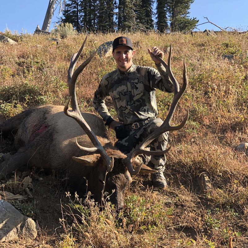 Phelps Amp call in case I needed to stop a bull. My bow and rangefinder were in my hands as I was kneeling. The cows were running full tilt downhill. I thought we might be run over or blown quickly due to it. I saw the bull in the back and whispered to Jason, “I’m going to kill that bull. He’s mature enough to make the pack worth it.”I had ranged the tree line at 60 yards as the cows trickled by. I judged that they were all coming through about 10 yards short of that. I didn’t have time to adjust my single pin, but I had a secondary pin on the sight at 45 yards. I knew I could hold high on that pin and drop into the vitals of the elk. He finally came down the mountain to us. I mewed at the herd after I drew back. He froze in his tracks perfectly broadside, and I loosed my arrow. He turned and ran, and his herd followed. We knew he was hurting. I left everything and followed him to the ridgeline, thinking I needed to watch him enter the timber. As soon as I topped the ridge, he was bedded in the shade not 30 yards away. I tried to draw on him, but he busted. I missed in the process but knew he was going to bed again quickly. When he did, I stalked in slowly and put another quick shot in to end it. I raced back to Jason at the packs, and we ate some breakfast and enjoyed coffee quickly before the work began.