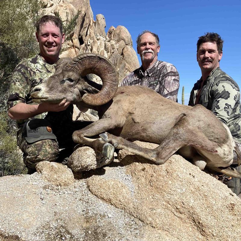Somehow, I drew a Rocky tag. Bob, my son, Travin, and I did an extremely difficult hunt. With 22 days of backpacking, limited water, minimal trails, extremely rough terrain, and only one ram, it was seriously brutal. My ram also did an Olympic back dive off a 400-foot cliff like Jon’s and also mostly survived. Now Jon and I were 3/4 slammers with a Sonora trip coming up in four months.
