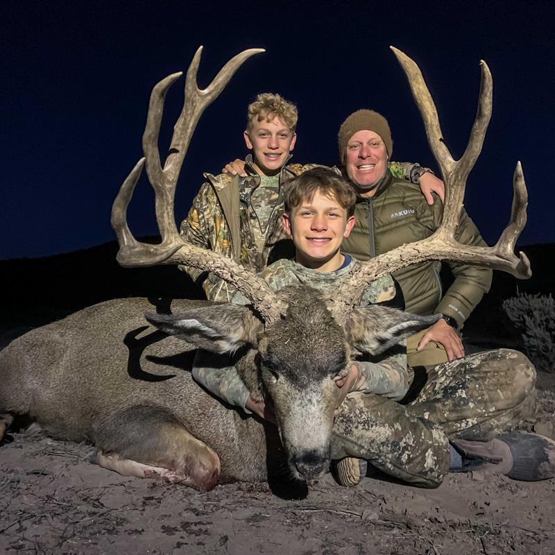 28 Nosler by Gunwerks. Dave said, “No small bucks,” and boy was he right as this buck had 6" cutters!The twins both drew elk tags for unit 13 in New Mexico. This was a muzzleloader hunt with the services of LOH Outfitters out of Socorro, New Mexico. Joseph opted out of the hunt due to high school football commitments. He was heartbroken but excited for his twin brother to chase a big bull. This was an incredibly physical hunt with rain, snow, and wind. On day four, Matthew harvested a mature bull on an amazing shot with a Best of the West muzzleloader. We had very experienced guides in Brian Olney and Zach Saveraeda. The country was tough, and conditions were dry. The crew at LOH was amazing coming in after dark and helping with the pack out and transport. Thanks to Braxton, Sheldon, and of course, Jerry Blake.How could this season get any better? We were off to New Mexico for the unit 2B youth rut hunt the week of Thanksgiving. We contracted with Ryan Nogosek of A3 Outfitters and were connected with Logan Sherwood and Justin as a spotter to attempt to harvest two mature mule deer. On day two, Joseph put a stalk on a nice, mature 3x3, only to be surprised at the last moment by a 195" 5x4 chasing off the smaller buck. A quick adjustment and the 340-yard shot with a Gunwerks 28 Nosler brought him down. This was possibly the biggest buck in the unit this year.The pack out was past midnight, and the 20-hour day was over. Thanks to these guys for looking out for the safety of my twins and me the entire time. Matthew stalked several smaller bucks but decided to pass. I was proud of his maturity to let the small ones grow for the next hunter who comes along. These are memories-of-a-lifetime.There are too many people to thank – Mom for packing all the right gear and the amazing outfitters for meals and endless optimism when kids really need it. Mostly, thanks to Huntin’ Fool for their selfless approach to helping the next generation of hunters chase dreams and achieve goals.