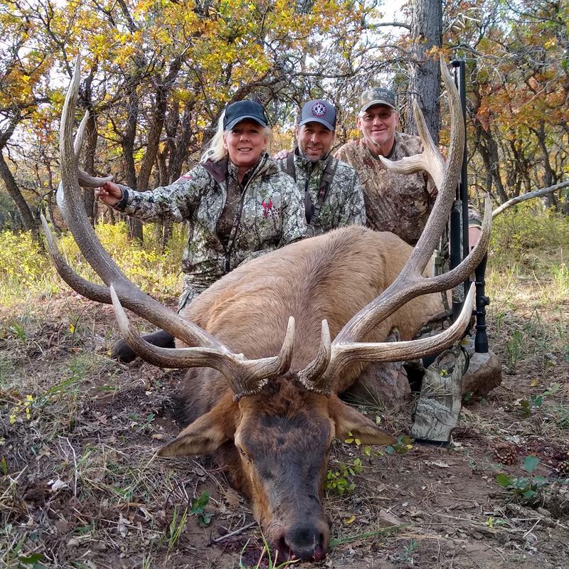 We hunted several more days, but we were unable to turn up the raspy growler Ron White. Early Saturday morning, Chris, Mom, and I headed out. We pulled up to the Kelly hump in the road, parked the Jeep, and proceeded to get out. As I was putting on my backpack, I heard a close growl of a bugle and thought that could be him. We walked back up the main road and then dove off into the pines towards the direction we had last heard him. We walked quietly and slowly, not wanting to spook him. I stopped to listen for a second, and he let out his chain smoker bugle right in front of us just as it was starting to get light. The bull worked his way towards us and stopped. Chris and I could immediately tell he was a shooter. I handed the CVA Accura to my mom, and she got in optimal shooting position. The bull started to walk away, so I hit the hoochie call that stopped him broadside, looking in our direction. The shot rang out, and then the hustle kicked in. We could no longer see the bull, so we sat and waited for about 30 minutes. We started making our way in the direction he had gone, and within moments, I could see him. The bull had not gone 40 yards and was piled up. I watched as my mom was able to see him, and the emotions of excitement and joy took over. There was no doubt we had found Mr. Raspy Growler Ron White with his dark horns and massive width on the back end. I’m proud of my mom’s grit and determination on this hunt and the moments we shared that will last a lifetime.