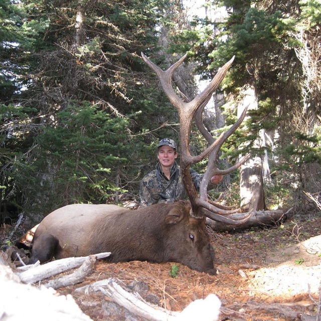 I told him we should head towards the bugle I thought I had heard. My dad told me there were a bunch of meadows in that direction and we should take it slow and keep our eyes and ears alert. About a quarter of a mile later, we heard a bugle 200 yards or less to our left followed immediately by another bull in the same area. We kept the wind in our favor and closed the distance. As we were creeping in, I noticed the tips of the bull’s antlers and signaled for my dad to stop. My dad was about 10 yards behind me and couldn’t see it. The bull was only about 90 yards away, but there was a lot of brush in the way, so we took a knee and waited for him to move. The bull began to walk away from us with no shot. I quickly signaled for my dad to give a cow call. The bull immediately stopped and responded with a loud bugle and started raking a tree. He was still hung up with no shot. My dad gave one more subtle cow call, and he started coming our way. My heart was pounding, and I knew all my hard work was about to pay off. He was coming with his head tilting back, swinging side to side to get through the trees, heading right to a small, open area. As he stepped out between two trees at about 60 yards, I flipped my safety off. My dad stopped it with one more cow call, and I heard from behind me in a whisper, “It’s a shooter. Shoot!” I lined up the sights, placed it right behind the shoulder, and squeezed the trigger. It was followed by a “thud” and a cloud of smoke. The bull immediately fell. It was all so exciting! We were reloading my gun, trying to hold back all the excitement but still high fiving. We noticed one more shot was needed, so I shot one more time. It was done, and now we were screaming, hugging, and high fiving.