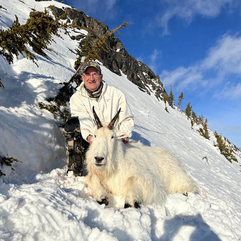 Bob whispered to just wait. The billies continued their ascent towards us with the lead goat stopping 50 yards away on a rock, giving a perfect broadside shot as he looked down the mountain. It was an image that will forever be ingrained in my memory. He was stunning with his thick fur silhouetted against a far distant snow-covered mountain range. At that point, the 7mm Allen Magnum barked, with the billy not going far. I turned around to thank Bob, and we congratulated one another with my back to the goat. Suddenly, Bob started saying, “No...no... nooooo!” I turned to see the billy sliding down the mountainside. Fortunately, there was a group of four or five treetops sticking up through the snow that stopped his momentum as there was nothing else stopping him from sliding several thousand yards to the bottom.