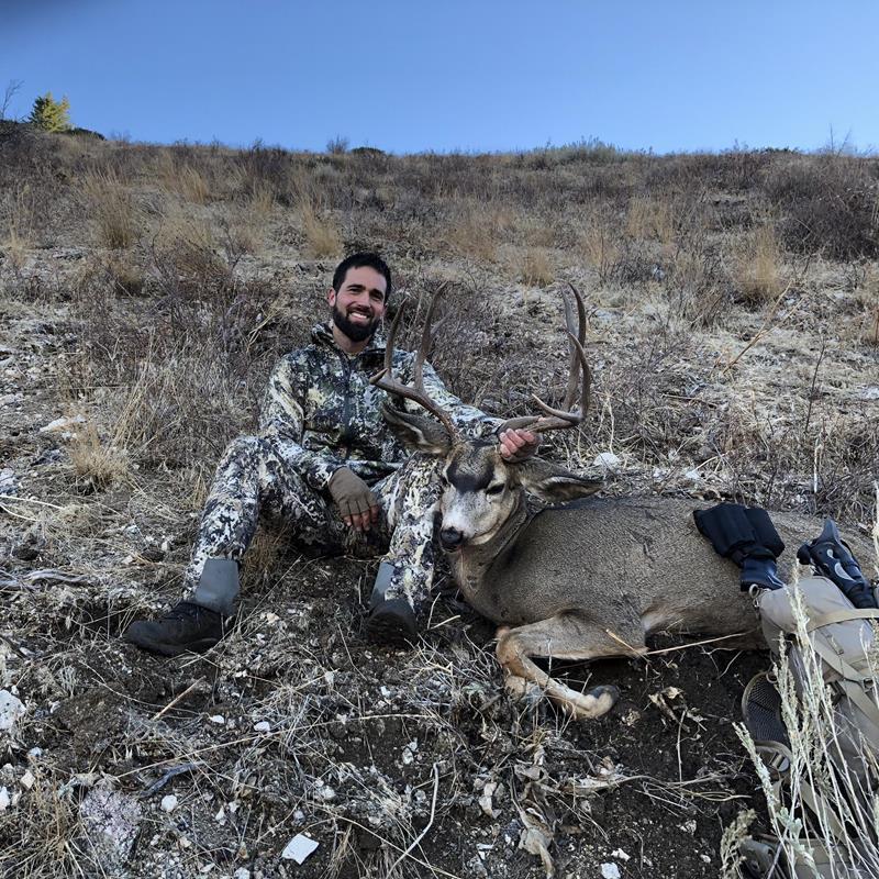 I sat for several more minutes in the rocks as I continued to watch the hillside. What seemed like just a few minutes later I noticed four does feeding up from the bottom of the draw. About 50 yards behind them was the sight I had been waiting for, a large framed buck. The does continued to feed up the draw as the buck trailed them from behind. I knew without a moment’s hesitation that this would be my best and last opportunity to make this happen. I moved into a flatter area just below the rock outcropping and set up prone on a rock. I knew that the distance was somewhere between 100-200 yards. With a stable rest, I centered the crosshairs. As the buck made a slight directional change, my shot angle went from straight behind to quartering away. With one squeeze of the trigger, my hunt was over. The deer didn’t take another step as a perfect impact was made. I couldn’t help but stop and take a few moments to reflect on the difficulty and challenges I had faced the last two days. From grinding it out all day the day prior to hunting without optics, it was an absolute roller coaster. When I got to the buck, I couldn’t have been more excited. I didn’t care that he was nowhere near that 180” mark we all strive for. I know what went into making that a successful harvest, and nobody can take that away from me.