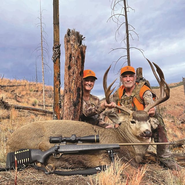 neighboring unit from us, so we all got an Air B&B together, which made camping pretty nice. Rick’s wife, Makayla, also came along for the good times and camaraderie.The hunt started the middle of November, and you never know what weather you may get in Colorado’s high country. This year, it was warm and there was no snow. We always show up a couple days before open to get the lay of things and see what the animals are doing. We had hoped the rut would be on, and we soon found that the deer were rutting fairly well. Seeing a couple decent bucks the days before opener, we had high hopes.Opening morning, we got up early as always, had a quick breakfast, and went out the door for the hike up the mountain in the dark. We posted up on a good vantage point so we could glass across the surrounding canyons to try to find a shooter buck. Our plan was that Candy would be first and then we would try to find me one. From my vantage point, I never saw any shooter bucks. Candy called me over to look at a buck she had spotted way off, but by the time I got there, he was nowhere to be found. She was sure he was a nice buck but couldn’t turn him back up.We had some lunch and decided to try another spot to glass until dark. As we were driving to our new location, I spotted some deer running in our direction. Candy grabbed her binos and said one of them was a big buck. She bailed out of the truck, grabbed her gear, and started to run out where she could try to cut them off for a shot. I didn’t have time to tell her yes, no, or anything. She was gone! She made a sprint up the ridge and then a sneak squatted down on her shooting sticks as she didn’t have time to lengthen them. As the buck was pushing his does up the ridge, she mewed at him. The buck stopped, turned broadside, and bang! She made a perfect shot as he ran only a few yards and tipped over. She did what needed to be done. She moved quick, made her decision, and did a great job as she harvested a beautiful buck. There were hugs, kisses, photos, and then the pack out as dark began to surround us.A few days later, we were in the same place we were opening morning. We spotted a nice buck way off near where Candy had spotted the big buck opening day. I decided to make a play for him and see if he was as nice as we thought. Leaving Candy there to spot for me, I took off. I went back to the bottom of the mountain, across a river, and straight up the other side of the mountain to the nosebleed section. Finally, I got to the basin where we had seen the buck. One thing about Colorado, mountains are steep and the air is thin.Slowly easing over to the edge of the basin where we last saw the buck, I spent probably an hour scanning every inch. Finally, he stepped out, pushing a doe, about 500 yards away. I was as close as I could get, the wind was calm, and I knew I could make this shot. I set up my Spartan precision bipod, settled in, and waited for him to step out from behind the dead snag. I lay there waiting, afraid to move an inch or take my eyes off him for a second. My body began to ache as the rocks beneath me stabbed holes in me. Forty-five minutes later, he stepped out. I took a deep breath, slowly breathed out, and began putting pressure on the trigger as the gun recoiled against my shoulder. I lost sight of the buck, but I was sure of my shot. As I regained my sight picture, there were a couple does standing around but no buck. Candy said she was sure he went down. Off across the basin we went, and sure enough, we had another beautiful buck down. Candy made the same descent, river crossing, and ascent so we could get more hugs, kisses, and memorable photos and to help pack out the buck.These hunts with my wife are so amazing. She is one tough cookie! We could write so many stories about hunts, adventures, and time spent in God’s country every year. Whether for ourselves or helping others be successful, they are all cherished memories.Candy blew two disks on an archery elk hunt last year in Wyoming helping me pack out my bull. It cost her a lot of pain and hunting time. Even hurt, she kept going all fall and had a great season.