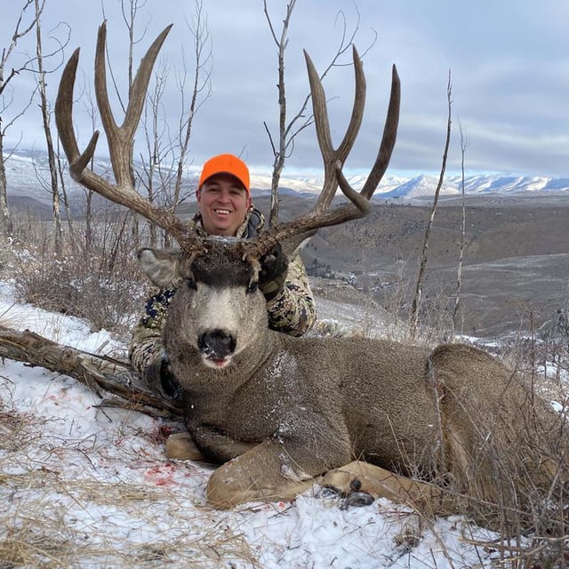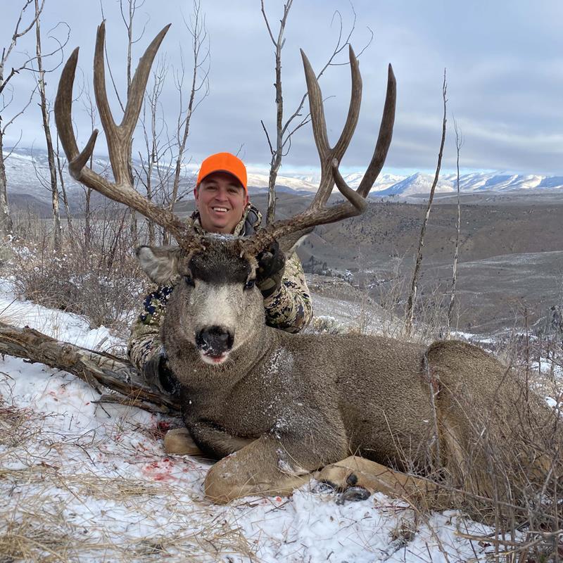 Wednesday morning, we went out to a new spot and started to glass. It was cold that morning, around zero degrees, but extremely calm. We had deer spotted everywhere far out on ridges in almost every direction. Daren spotted a few bucks off in the distance and waved Brad over. As those two went over the ridge to get a closer look, Dan and I had a few bucks of our own we had glassed up and were watching. Once Brad and Daren returned some time later, Brad stated he wanted to move south to get a different vantage point on a deer he saw traveling. We packed up and hiked back to the jeep and started back down the trail. We hadn’t gone far before off in the distance there he was, Mr. Big. It didn’t take any of us long to know that was our deer. Brad and I agreed we needed to move fast and cover ground if we were to pull this off as the buck was traveling fast. We covered about 500 yards as fast as we could and got into position. I dropped to one knee and was staring at a buck-of-a- lifetime as he stared back at me through my reticle. It was only about a 200-yard shot, but the way I was holding my crosshairs it looked like it was a thousand. My adrenaline was sky high, my heartbeat was racing, and my lungs were trying to recover from the mad dash. It was now or never, and I settled in on his shoulder. I pulled the trigger, and he went down right where he stood. I jumped up and hollered with excitement while just about knocking over Brad with a hug in the process.
