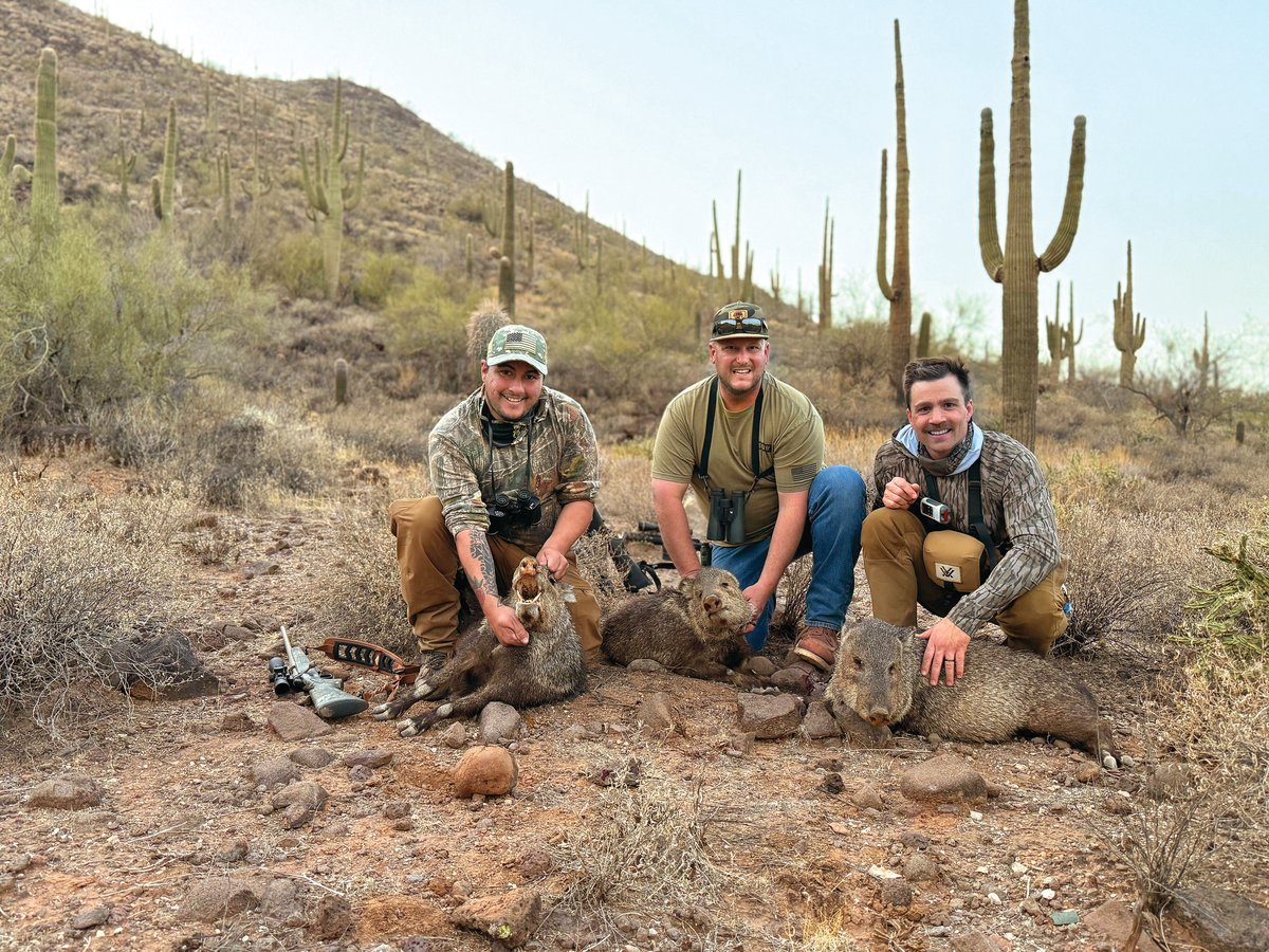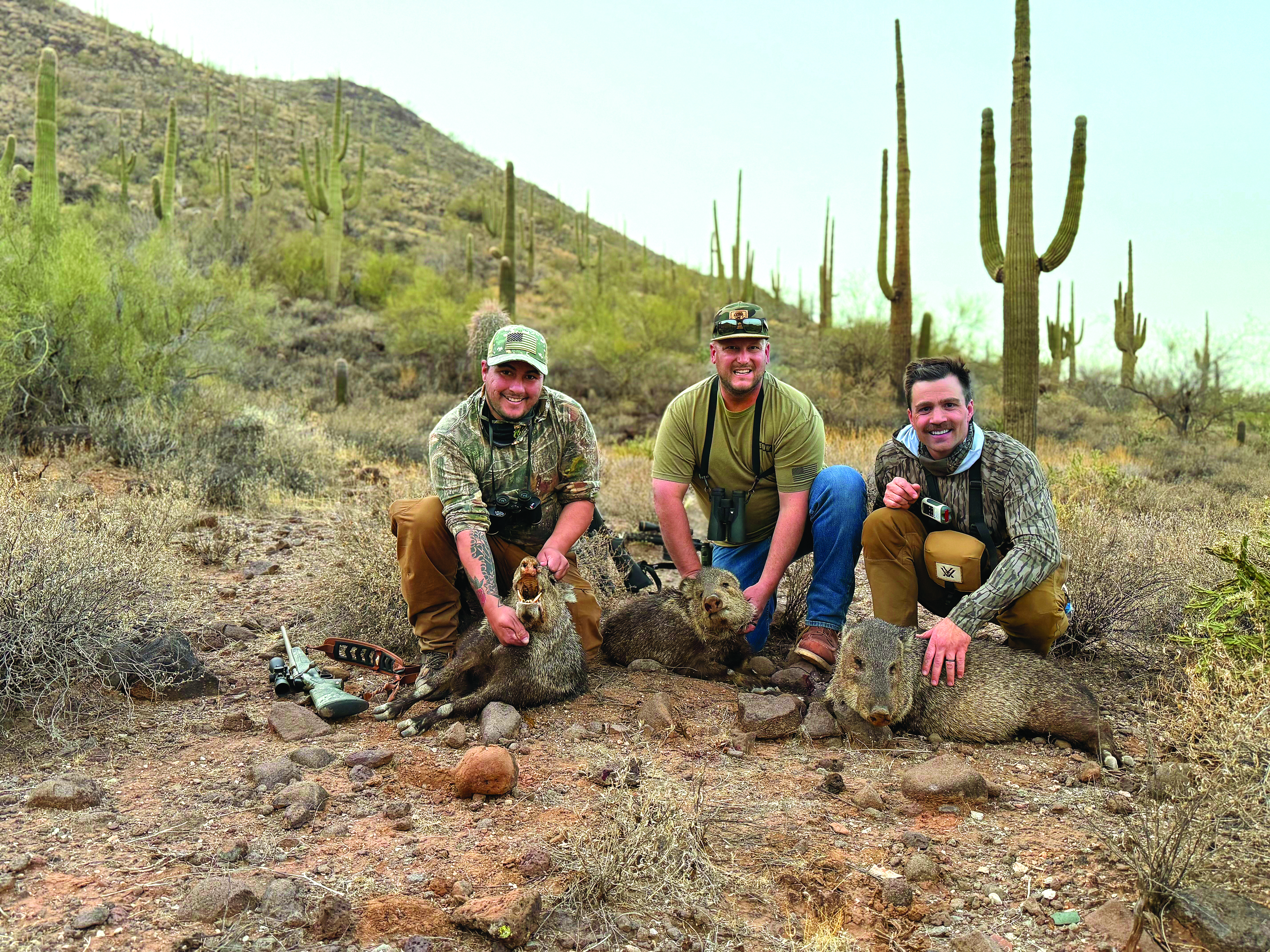 My two hunting buddies and I climbed down, dropped packs, and hustled over to the hill across the wash from the target animals. As we approached, we had trouble picking up the small to medium dog-sized animals with light fading behind the mountain. We spotted them moving slowly between prickly pear cacti, saguaros, ocotillos, chollas, and anything else with spines, spikes, and thorns. Within a couple of minutes of reaching this point, one friend was on his target, I was on mine, and the other friend was on and off his because of brush and cacti. I told them to fire when ready, and before I took a breath after saying that, the hunter closer to me shot his pig, startling me off my scope. I quickly got back on my gun and shot the one next to his kill, watching it fall over onto his like they do when they pile up in their beds for warmth. The other in our party wasn’t able to get on his target right away, but as soon as I fired, I got on the javelina call he had gifted me two days before and hammered it so that the remaining pigs would remain in the area and leave him with a chance. One little piggy ran in his sight and quickly behind a bush out of safe shooting lanes. I let him know another, bigger one was headed in the same direction, and he cut him off before the vegetation with a broadside shot, dropping him on the spot.
