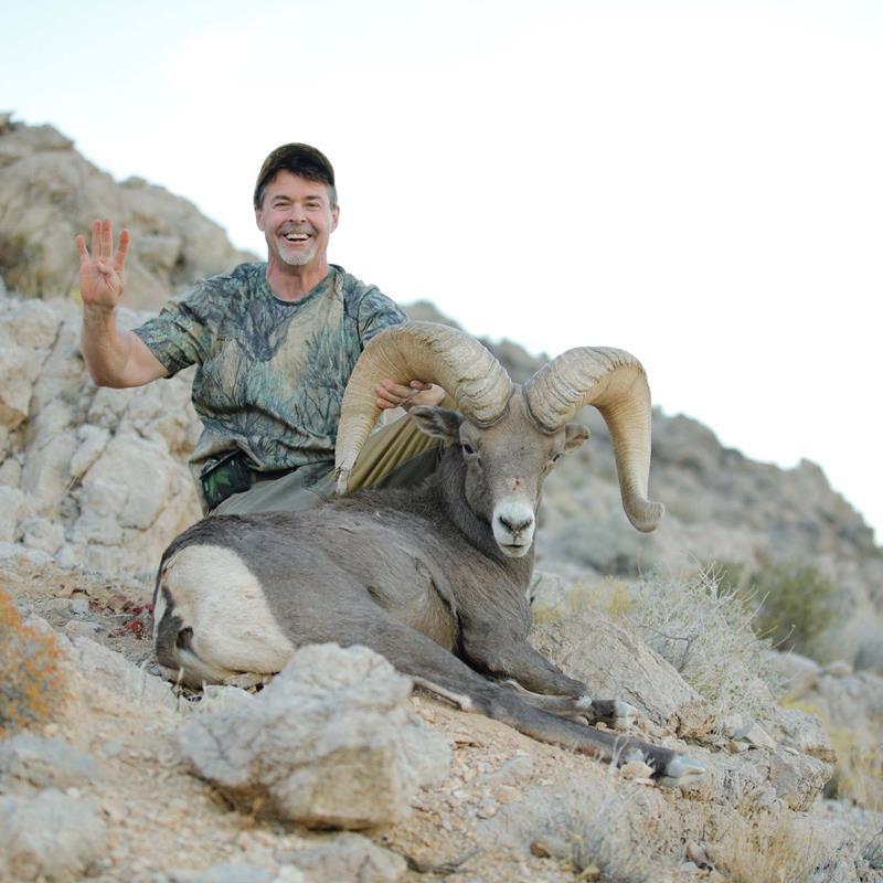 At 4 p.m. on Thanksgiving Day 2017, I completed my Grand Slam with this Desert sheep from the Muddy Mountains (unit 268) in Nevada. The ram had 15 1/4" bases, grossed 172", and should qualify for B&C. I was one of four non-residents who drew a tag in unit 268, and it took me nearly 30 years to draw. I had an awesome team with me on the mountains, head guide Roy Lerg, assistant guide Chris Callinan, and my hunting buddy, Murray Padgett.