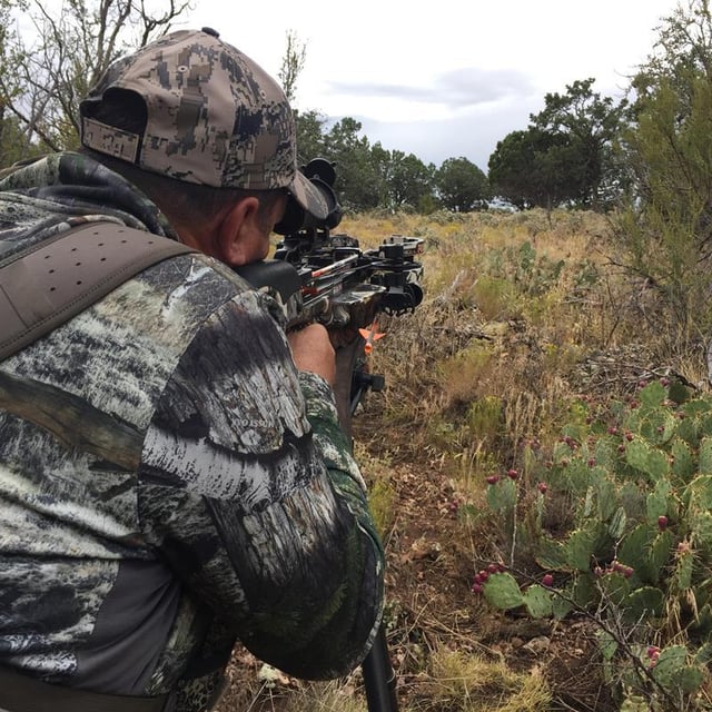 We came to a steep, ridge dense with trees, brush, and patches of dry cactus, making it almost impossible to climb up the mountain quietly. After two hours of stalking this bull, we finally reached the plateau. George whispered, “It’s been a while since we heard a bugle, and we need to find that bull!”
