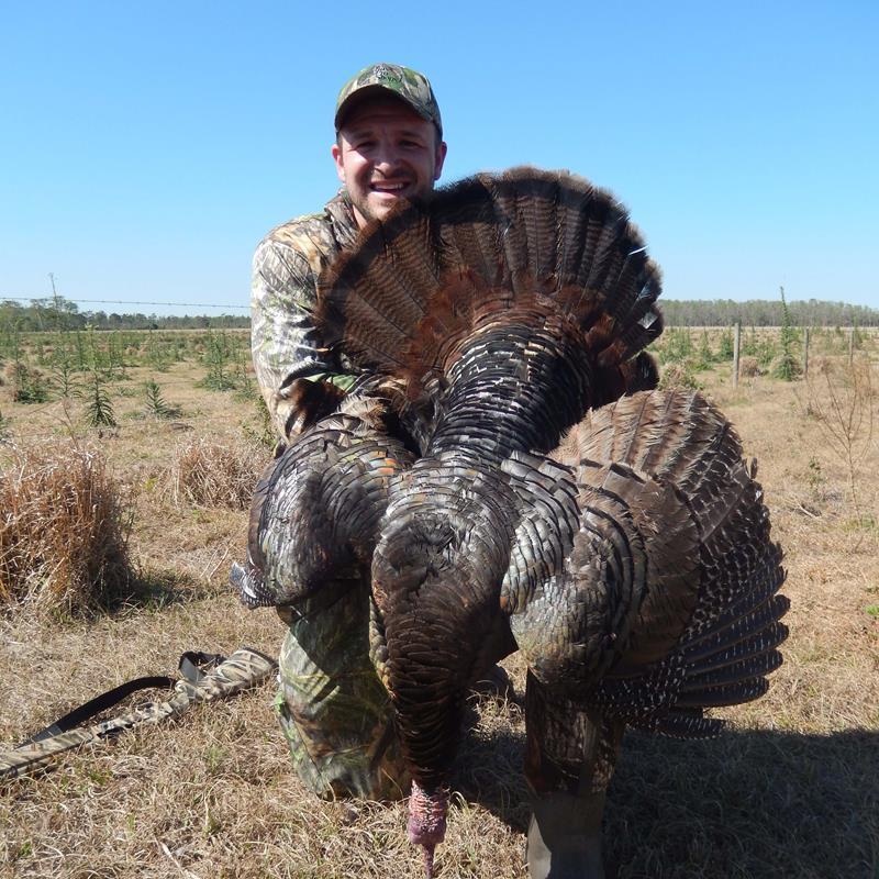 There we were, staring at a tom and hen 160 yards away, knowing this could be our chance. We decided we would belly crawl through a thick patch to close the distance. As Kent kneeled down, he stuck his hand in a fire ant pile. He quickly regretted this as I caught a chuckle or two. We began crawling, and I quickly knew this was not going to be fun. There were small plants that had thorns on them. Our bodies were getting poked by them the whole crawl. We would stop every so often to see how close we were. The hen had disappeared, and the tom had gone into the thick woods. He must have been on a death wish because he came right back out. Kent and I knew this was our chance. He was about 50 yards away. I was very confident in my ability to shoot as I had killed a bird at 50+ yards before. I knew this bird was dead. I fired off a round, but to my surprise, he did not drop. He began to run towards us. I quickly jumped up and let off another round. This time, the bird hit the ground. My new Mossberg with a Pattern Master choke had done the job. The bird began flopping, and excitedly, I fired off another round, not wanting to lose the bird.
