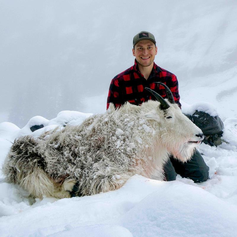 After moving upstream another quarter mile, we caught him in the cliffs chasing nannies through the snow. Finally, he stopped on a prominent rock long enough for me to take a 47-degree, 324-yard shot. I drilled him twice and watched him tip backwards off the rock with the whole sequence caught on video. Celebration ensued, but we knew we had a lofty task ahead of us just to get to the goat, let alone get him back to the creek.