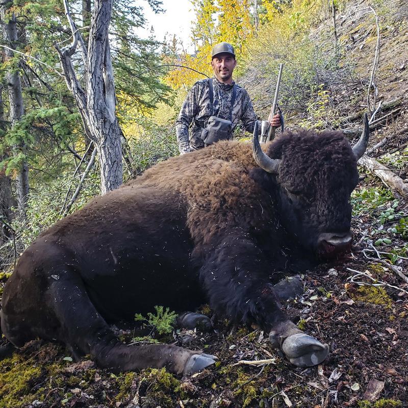 After several hours of repositioning, we decided to travel back down the mountain. Evening was approaching, but I just couldn’t sit still. I walked up the edge of the bluff overlooking the Chetaslina River drainage to glass the bluffs in the distance. Within a minute, I had bison in my view! Time wasn’t on our side. I ran down and let the guys know what I’d seen. We had a lot of land to cover in only a few hours. We traveled a ridge for more than a mile, hoping against hope the herd would still be there.